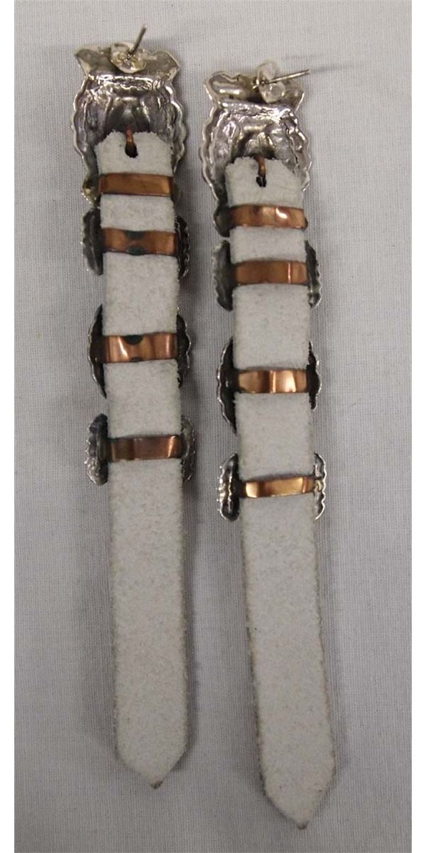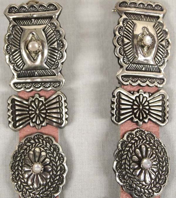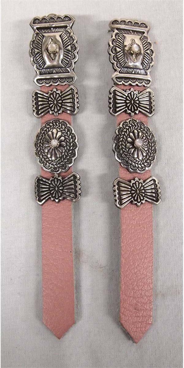 Native American Navajo Sterling Miniature Concho Belt Earrings, measure 4.25''L x .5''W, on pink leather