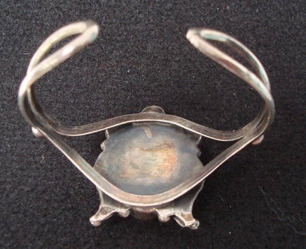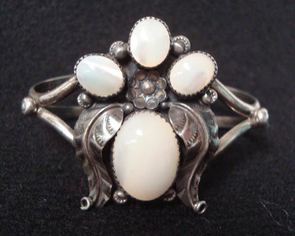 Native American Navajo Sterling Mother of Pearl Bracelet, traditionally accented with silver leaves and flowers, inside measures approx. 6'' x 1 5/8''W.