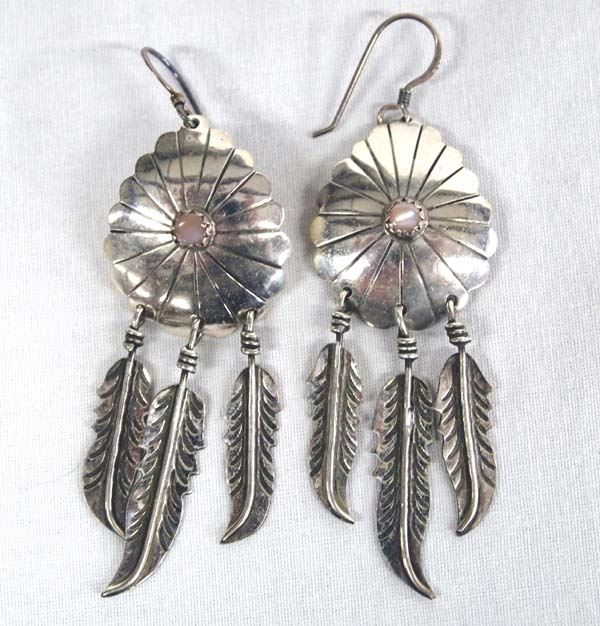 Native American Navajo Sterling Silver Mother of Pearl Earrings, measures 2.25''L x .75''W, 8.2g in total wt.