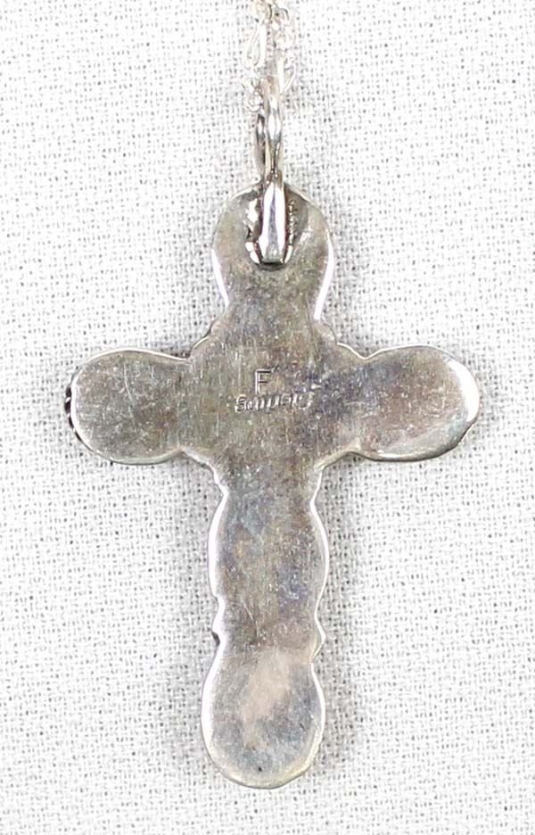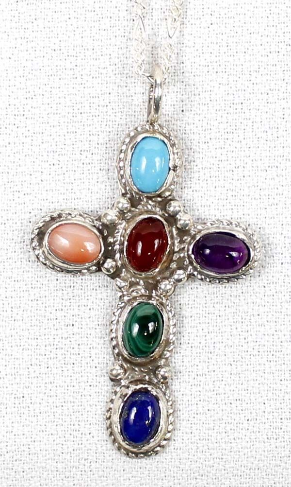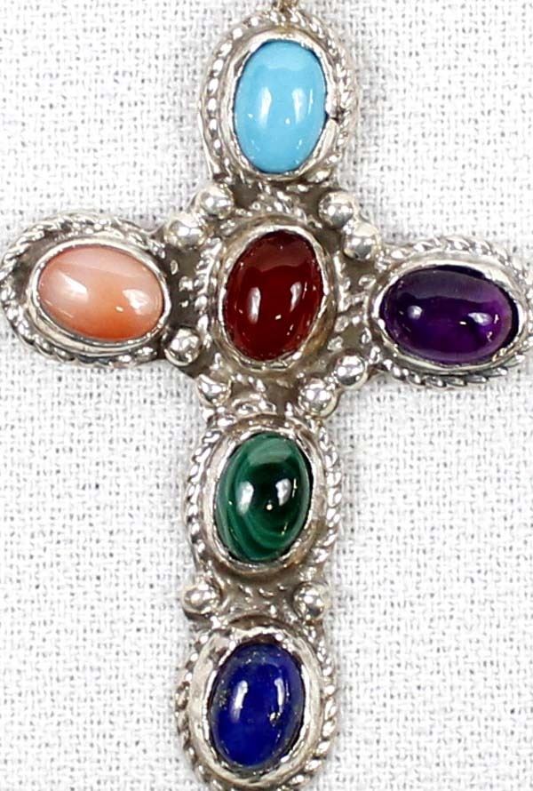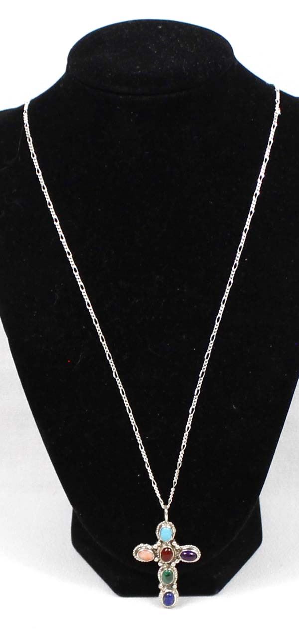 Native American Navajo Sterling Multi-Stone Cross Pendant Necklace, pendant measures 1'' x 1.5'', sterling chain is stamped .925 and measures 22''L end to end, stones include turquoise, angel coral, malachite, amethyst, lapis, and carnelian, hallmarked F and stamped sterling