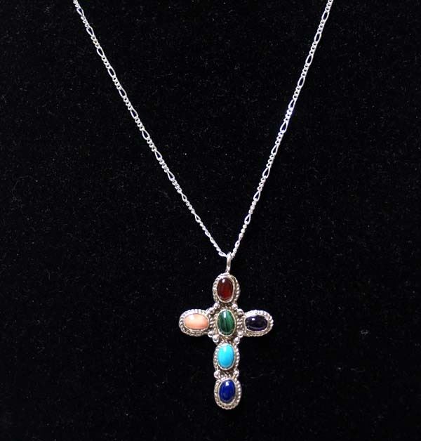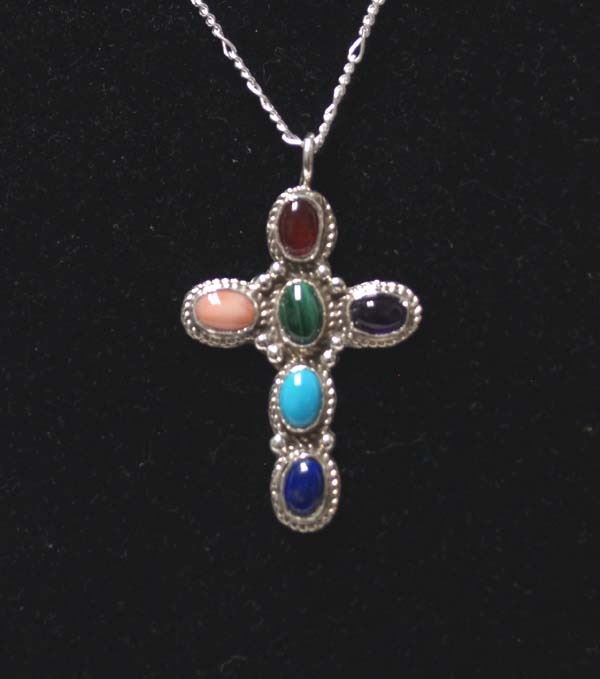Native American Navajo Sterling Silver & Multi-Stone Cross Pendant Necklace, chain measures 21''L end to end, cross measuares 1.5''L, cross is hallmarked F and stamped sterling, includes turquoise, lapis, amethyst, malachite, angel coral, and carnelian