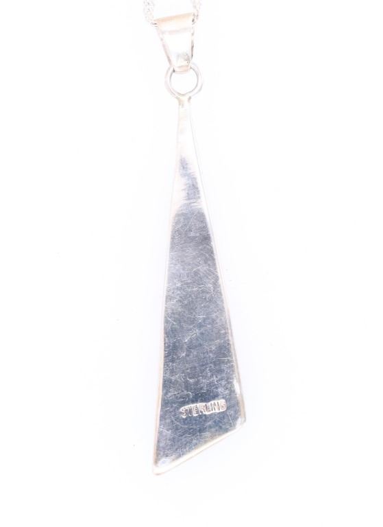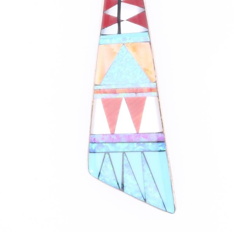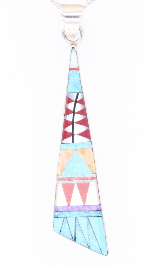 Featured in this lot is a Vintage Navajo Sterling Multi-Stone Inlay Pendant Necklace, circa 1970s-1980s. This stone to stone inlay includes turquoise, coral, spiny oyster, white fire opal (sometimes called crystal opal), mother of pearl, sugilite, and jet. The emphasis on small stone work and inlay work began to emerge in the 1920s, developing partly from a revival of prehistoric designs. Traditionally, Zuni jewelers were known as the masters of lapidary. Much of the earliest Zuni silver jewelry was essentially identical to Navajo work. Now, we see incredibly talented inlay artists across all of the Southwest tribes. For the artist, inlay provides freedom to craft their own designs using traditional symbols and motifs. Inlay also requires a great deal of skill on the part of its creator, which is what makes the finished piece a true work of art. The "Sterling" stamped triangular-shaped pendant features a .925 stamped Italian sterling silver herringbone-style chain with a spring ring clasp. Pendant is 2.5"L, necklace is 19.5"L. Collective weight is 9.4gms.