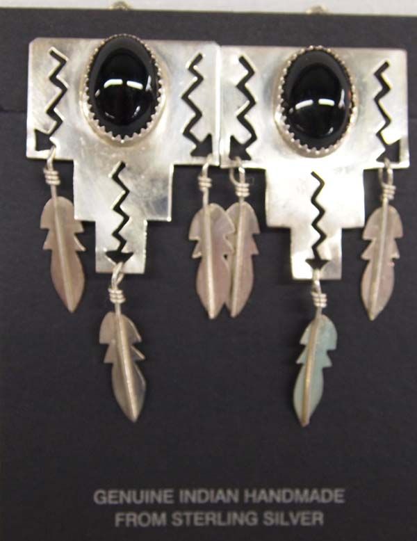 Navajo Sterling Onyx Clip-On Earrings, measure 2'' x 1'', each earrings measures 3 sterling feather dangles, cutaway lightning bolt designs, and a sawtooth bezel set cabochon measuring 3/8'' x .5'', 8.62g in total wt.
