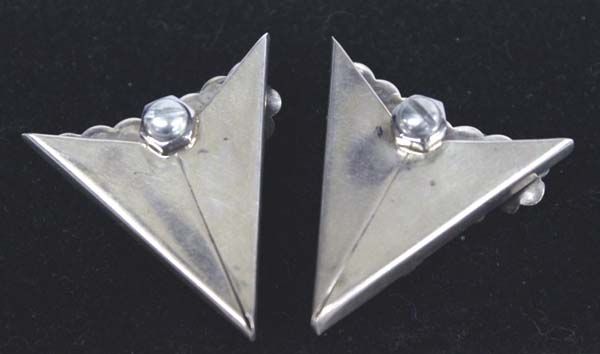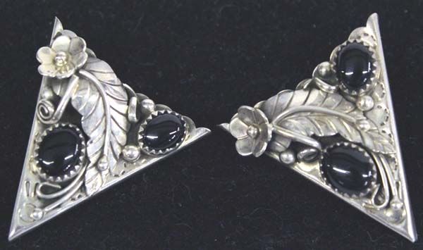 Navajo Sterling Onyx Collar Tips, measures 1 3/8'' x 1.25'', tradtional style setting of scrollwork and floral and leaf motif, silver bead accents, each tip features two sawtooth bezel set oval onyx cabs measuring 5/16'' x 3/8'', 15.43g in total wt.