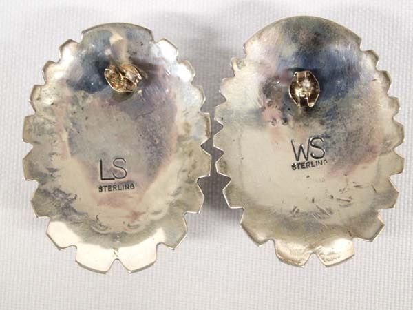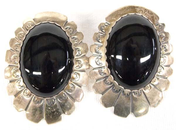 Native American Navajo Sterling Silver Onyx Concho Earrings by W. Shaw, one earrings is hallmarked WS and the other is hallmarked LS, both are stamped sterling, measure 1.75''L x 1''W, 22g in total wt.