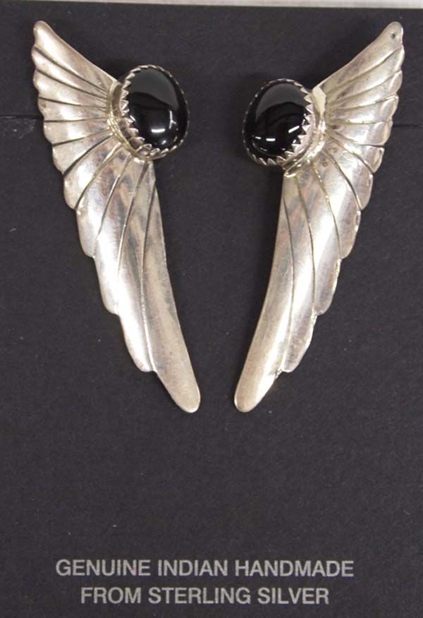 Navajo Sterling Onyx Earrings, measure 2''L x .75''W, each earring features a sawtooth bezel set onyx cabochon measuring .25'' x 3/8'', carved silver accents, wing design, 5.9g in total wt.