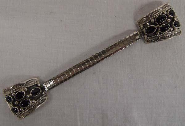 Navajo Sterling Silver Onyx Watchband by Jason Livingston, measures 5.25'' end to end x 7/8''W, traditional Navajo style setting of silver bead accents and hand stamped edges, features 10 sawtooth bezel set oval onyx cabochons measuring .25'' x 3/16'', hallmarked J and stamped sterling, 21.2g in total wt.