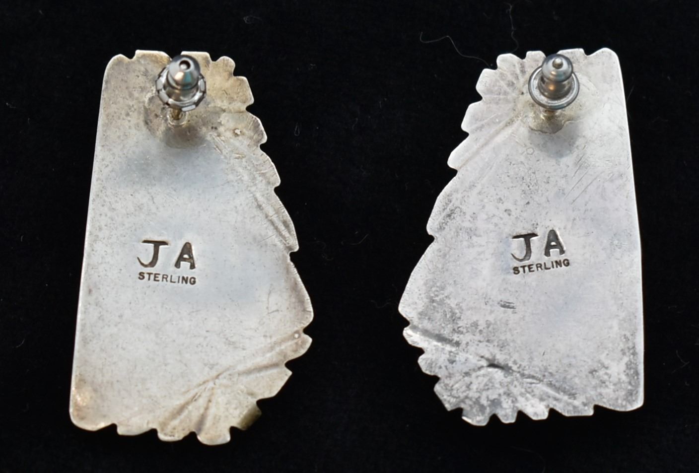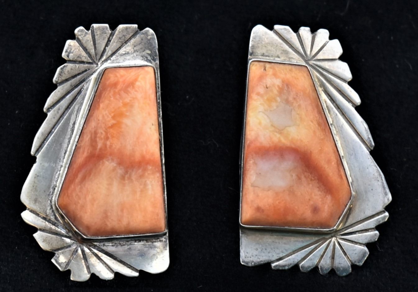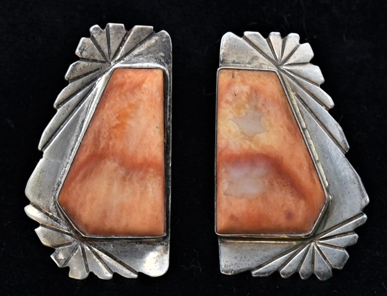 Vintage Estate Native American Navajo Sterling Orange Spiny Shell Earrings by Jack Adakai, hallmarked JA and stamped sterling, measure 1.5''L x 7/8''W