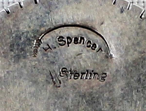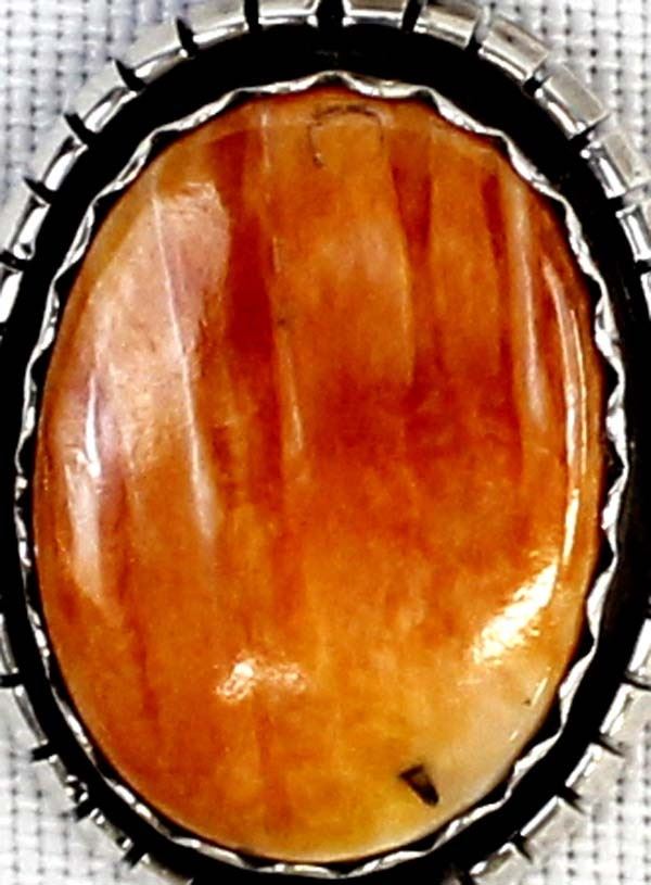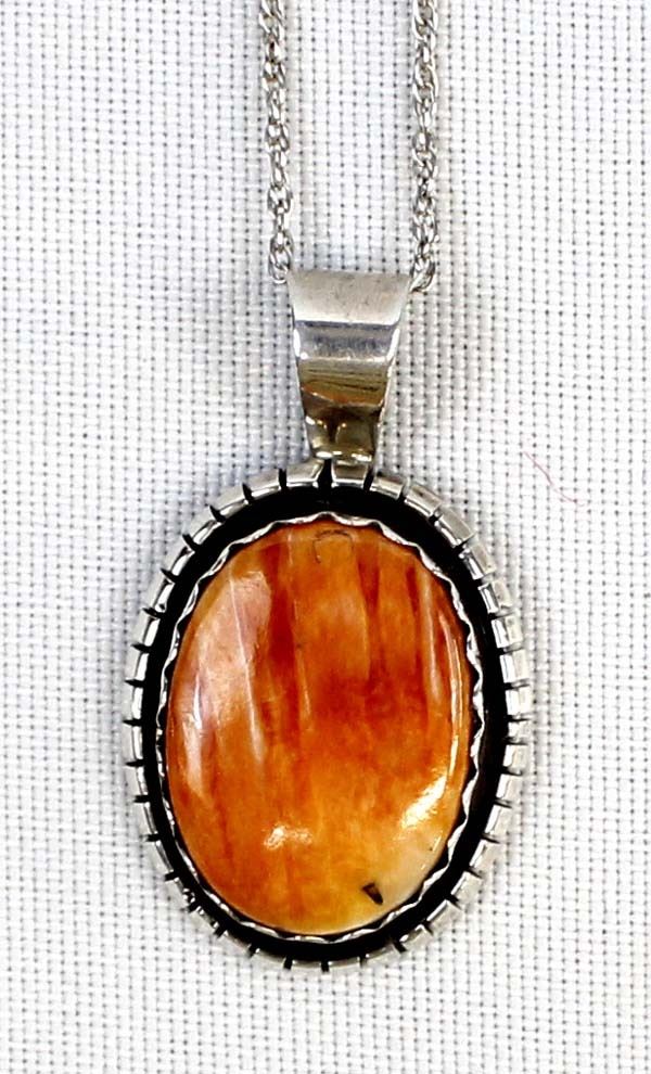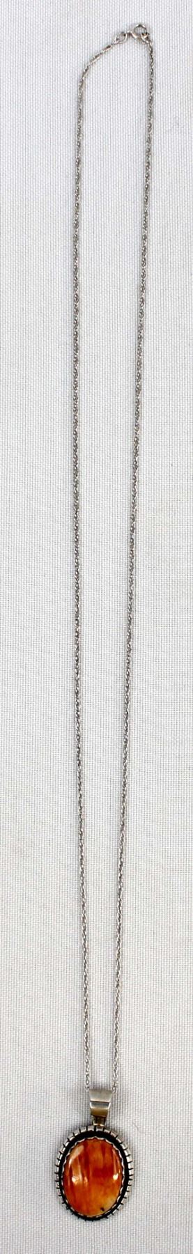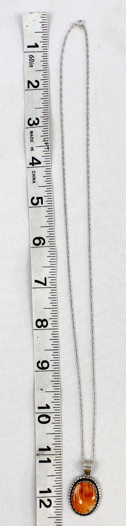 Native American Navajo Sterling Orange Shell Pendant Necklace by H. Spencer, pendant measures 1.5''L which includes the bale x 7/8'', sterling chain measures 22''L end to end, pendant is hallmarked and stamped sterling
