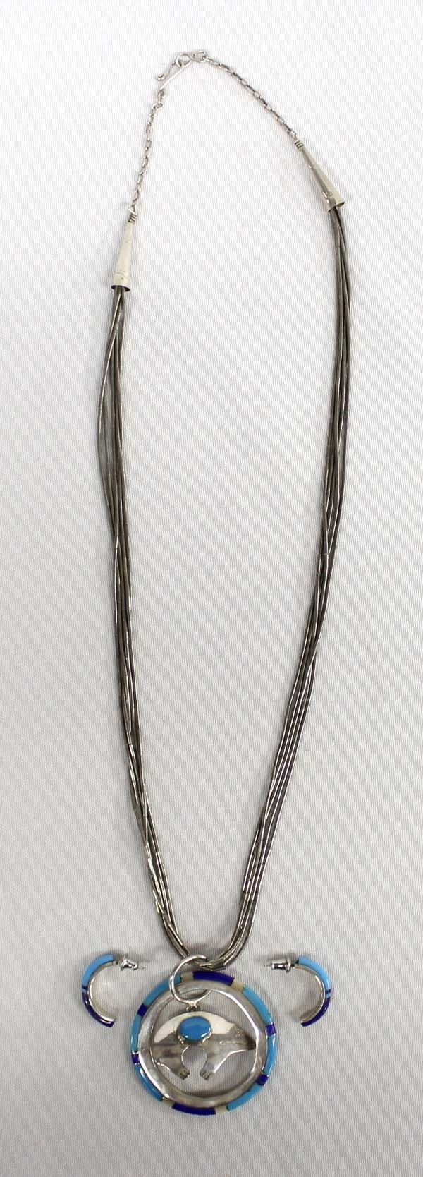 Native American Navajo Sterling Overlay Pendant Necklace and Earrings, liquid sterling silver necklace measures 24''L end to end, beautiful pendant measures 2 1/8''L x 1 7/8''D, half hoop earrings measure 1''L, overlay of turquoise, lapis, and jet, bear is stamped sterling, earrings are stamped sterling and hallmarked