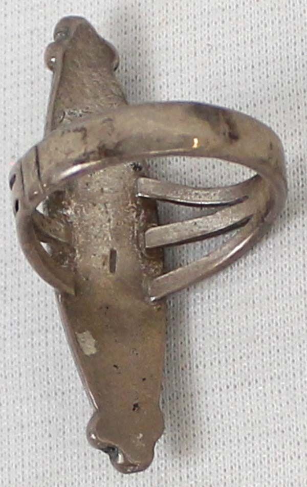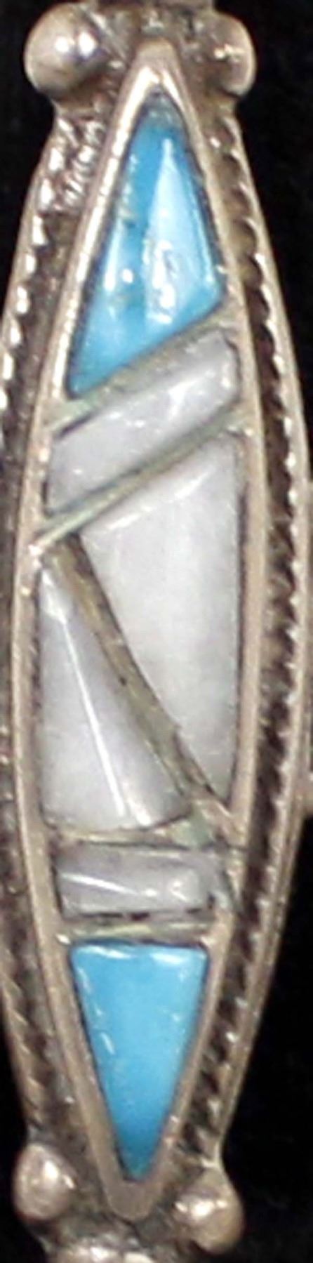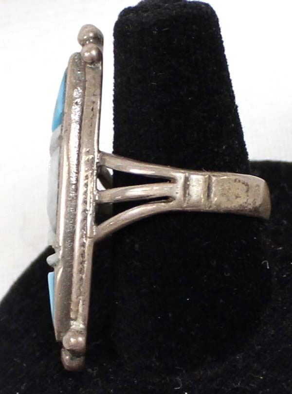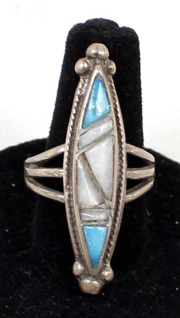 Native American Navajo Sterling Overlay Ring, Size 8, measures 1.5''L x .25''W, overlay includes turquoise and mother of pearl