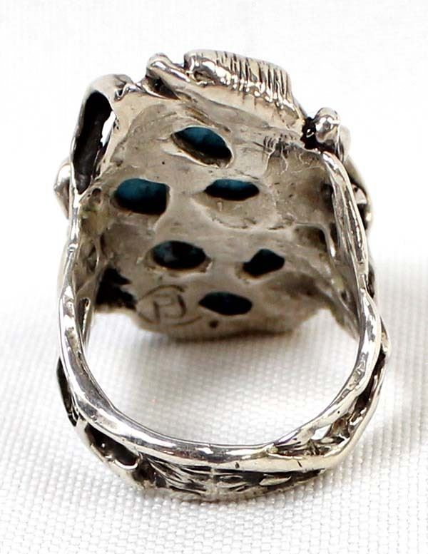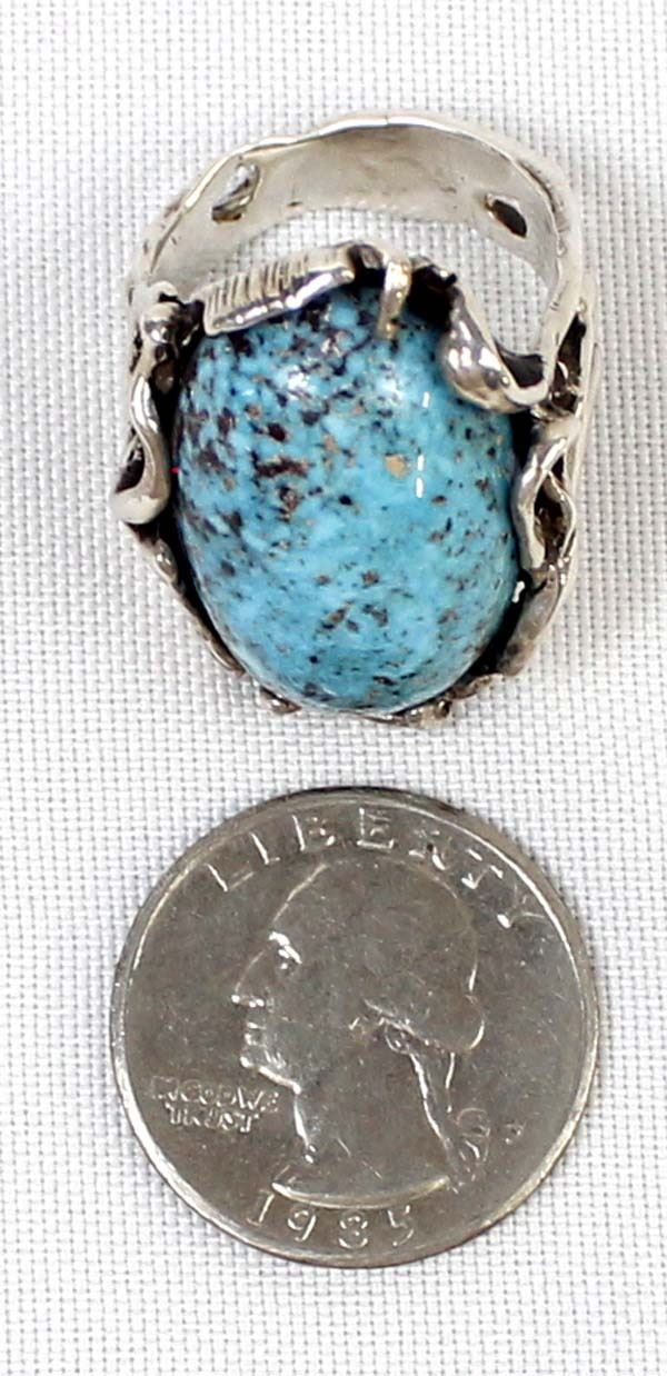 Native American Navajo Sterling Persian Turquoise Ring, Size 9.5, measures 1.25''L x 7/8''W, hallmarked PJ, possible artist Peter Johnson, 18.72 gtw