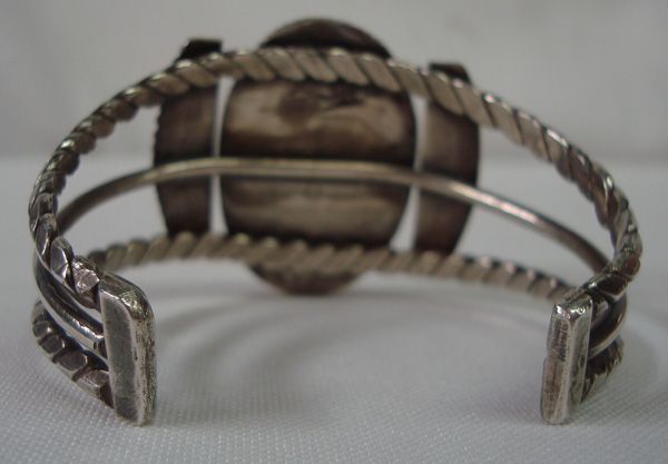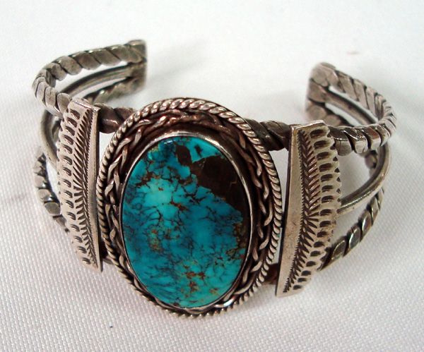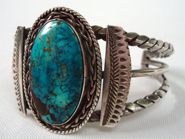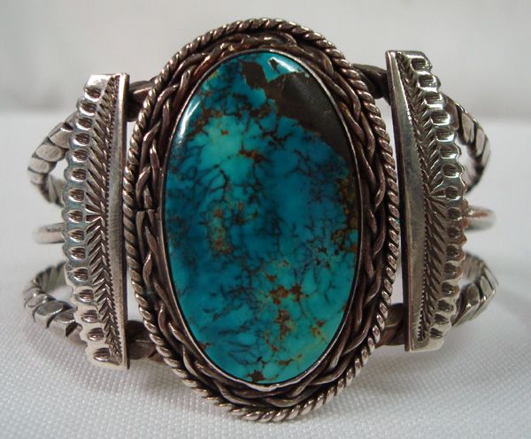 Native American Navajo Sterling Silver Pilot Mountain Turquoise Bracelet. Measures approx. 6 9/16'' inside measurement with a width of 1.5''. Bracelet weighs approx. 42 grams.