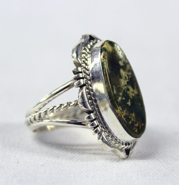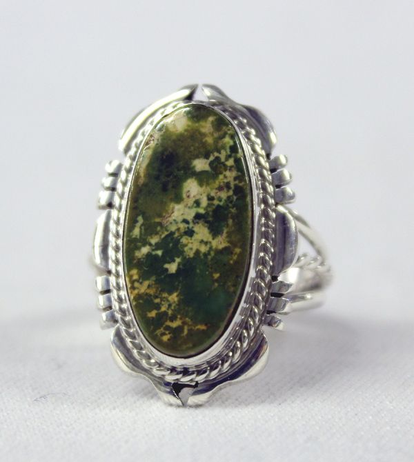 Navajo Sterling Pilot Mtn. Turquoise Ring, Signed. Beautiful example of Pilot Mountain Turquoise, oval polished cabochon which is set high on the piece. Triple shank incorporating twisted rope. Size 8.5, stone measures 13/16'' x 3/8''. Stamped ''Sterling'' ''Marie B'' for Marie Bahe".