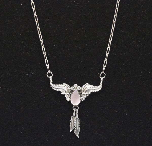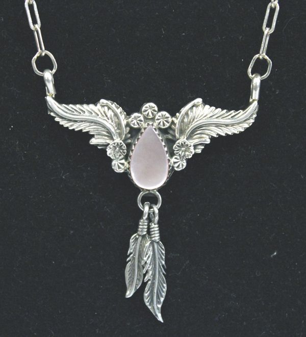 Navajo Sterling Pink Mother of Pearl Necklace, measures approx. 17.5 end to end. Pendant is approx. 1 7/8'' L x 2''W, pink mother of pearl cabochon measures .25'' x .5'', hand wrought chain, 9.17g in total wt.