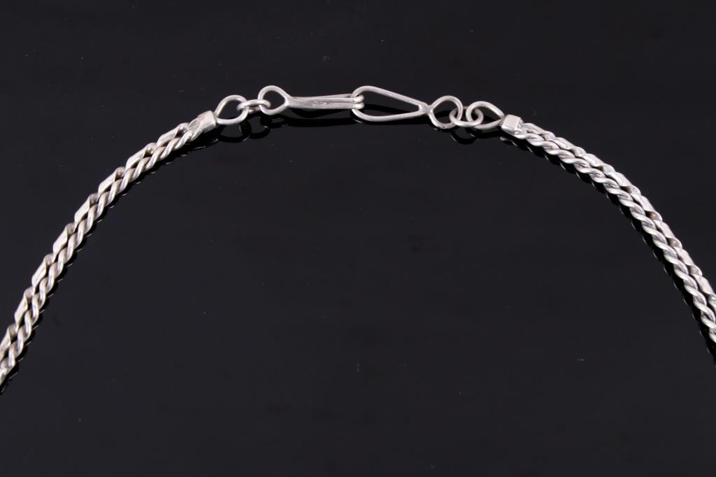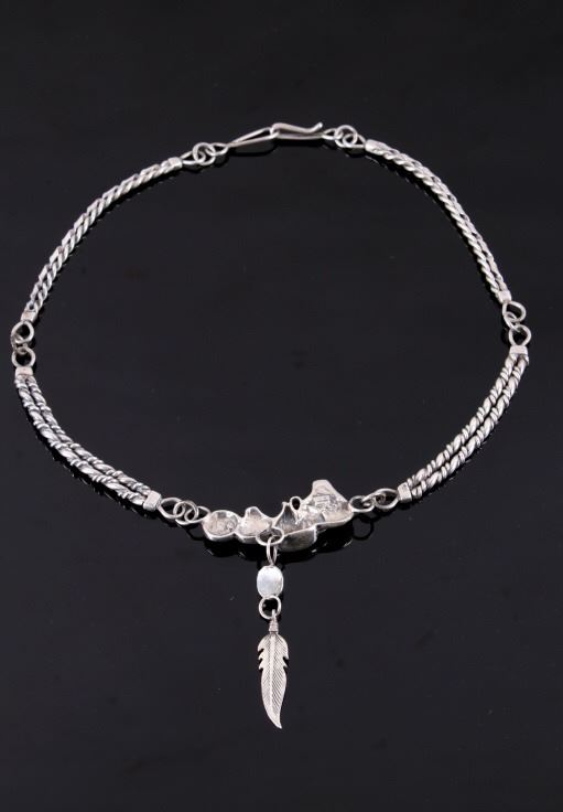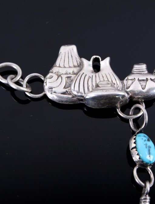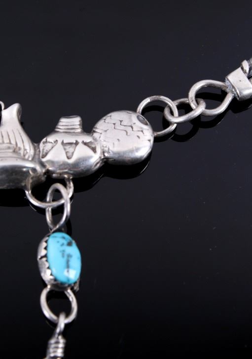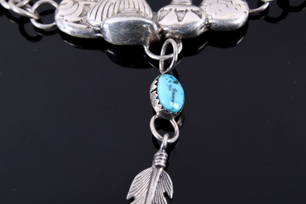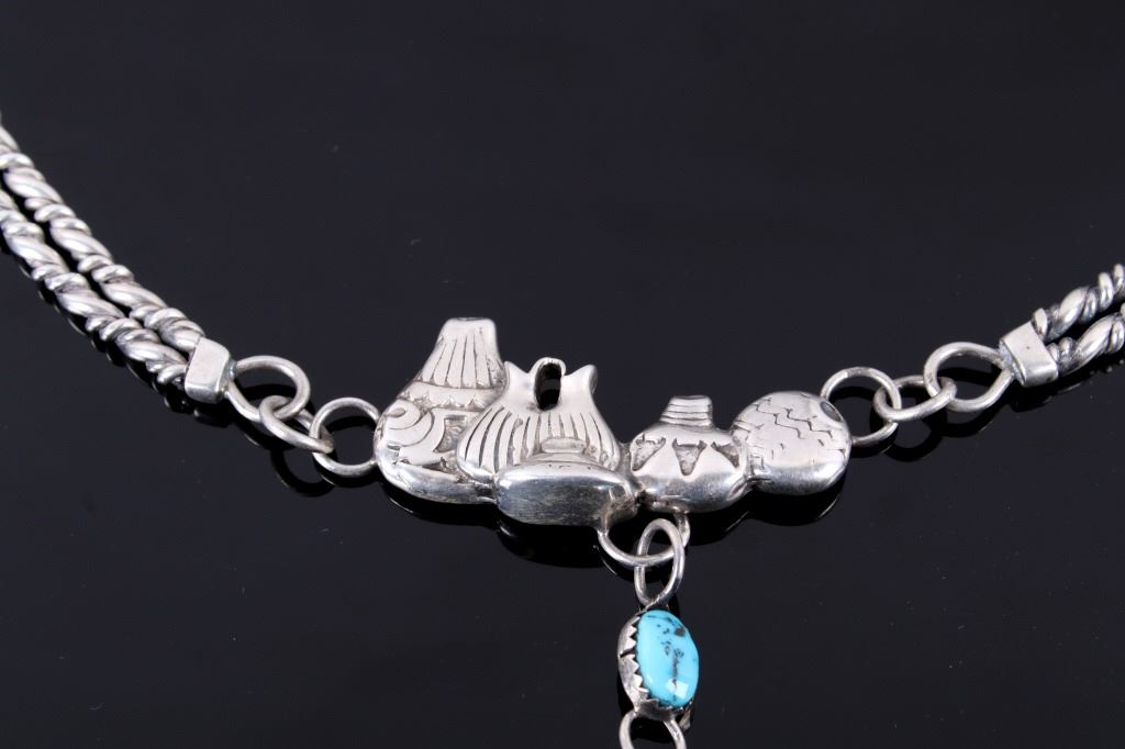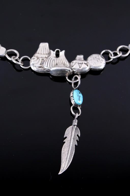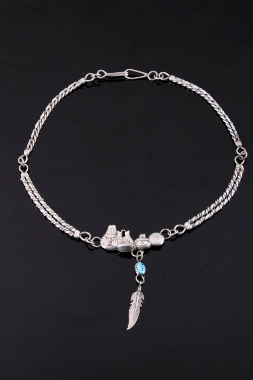 For your bidding pleasure is this Navajo Native Ameican Indian Sterling Silver Cable Bar Chain & Turquoise Necklace. This is a unique piece showing a linked together pair of twisted rope design bars of silver fastened together with a silver link. each side of the necklace shows two of these paired cable bar implements. The necklace includes a hook and loop type clasp that connects the necklace together. The pendant shows a series of pots and gourds made in Acoma and Hopi Native American style with a single sleeping beauty turquoise centered on the pendant with a single silver feather linked to the turquoise stone. The weight shows 1.50 troy ounce and the measurements of this necklace are 18" long chain with the pendant measurements showing 3 1/4" x 2".