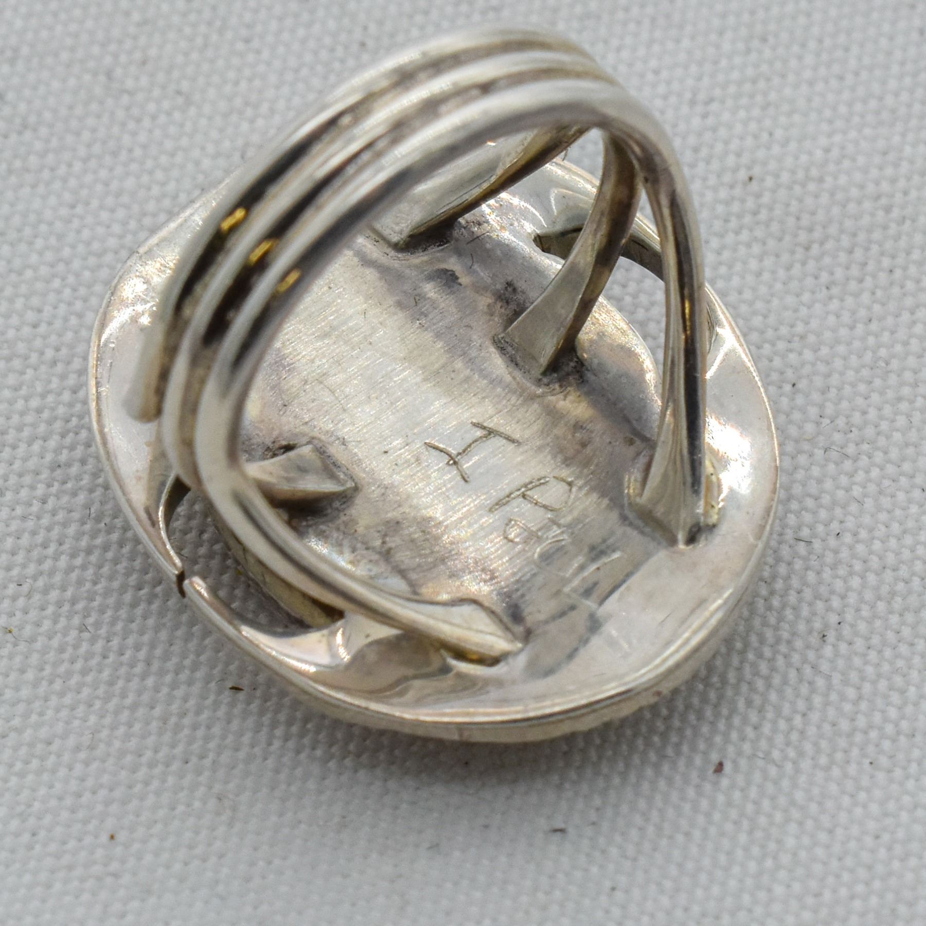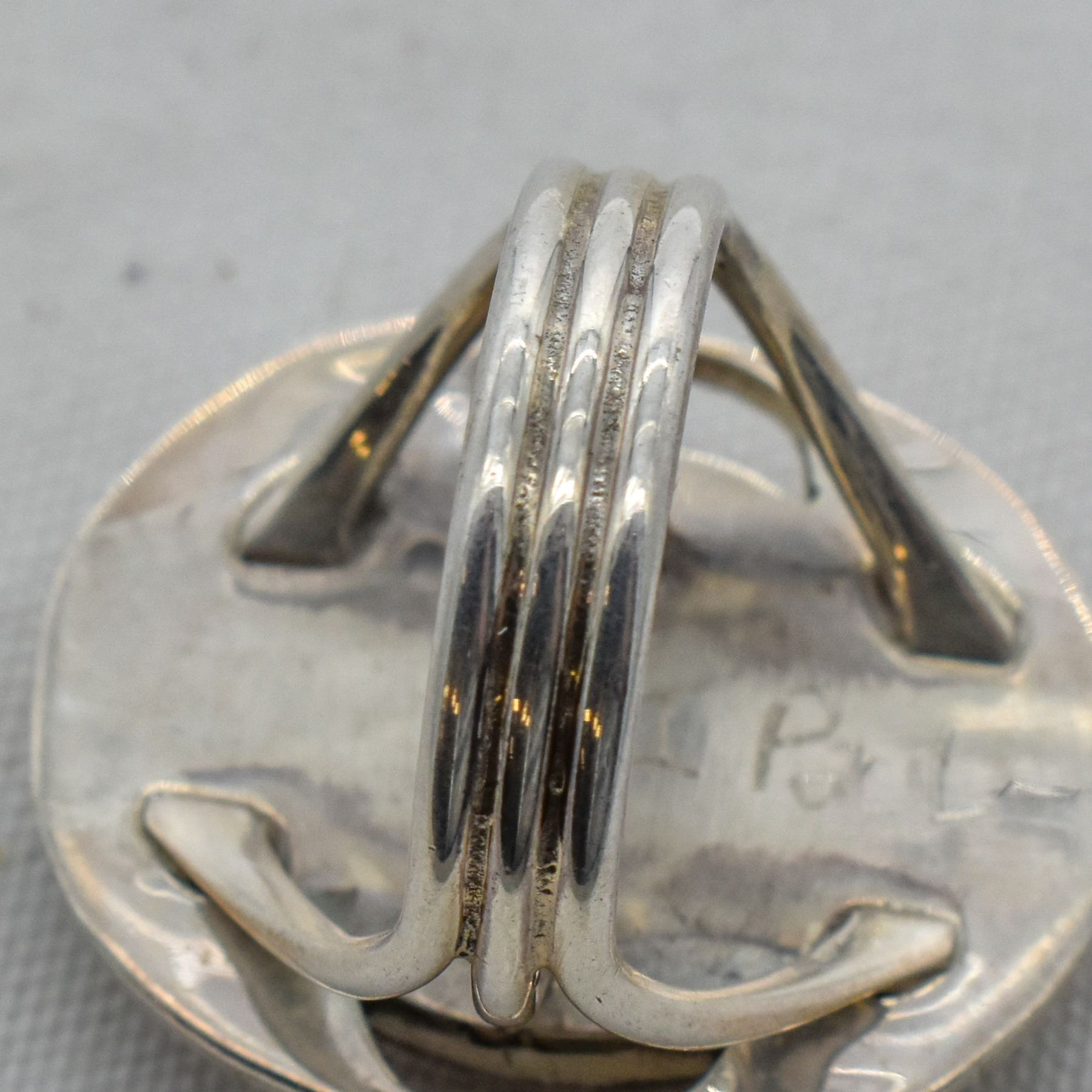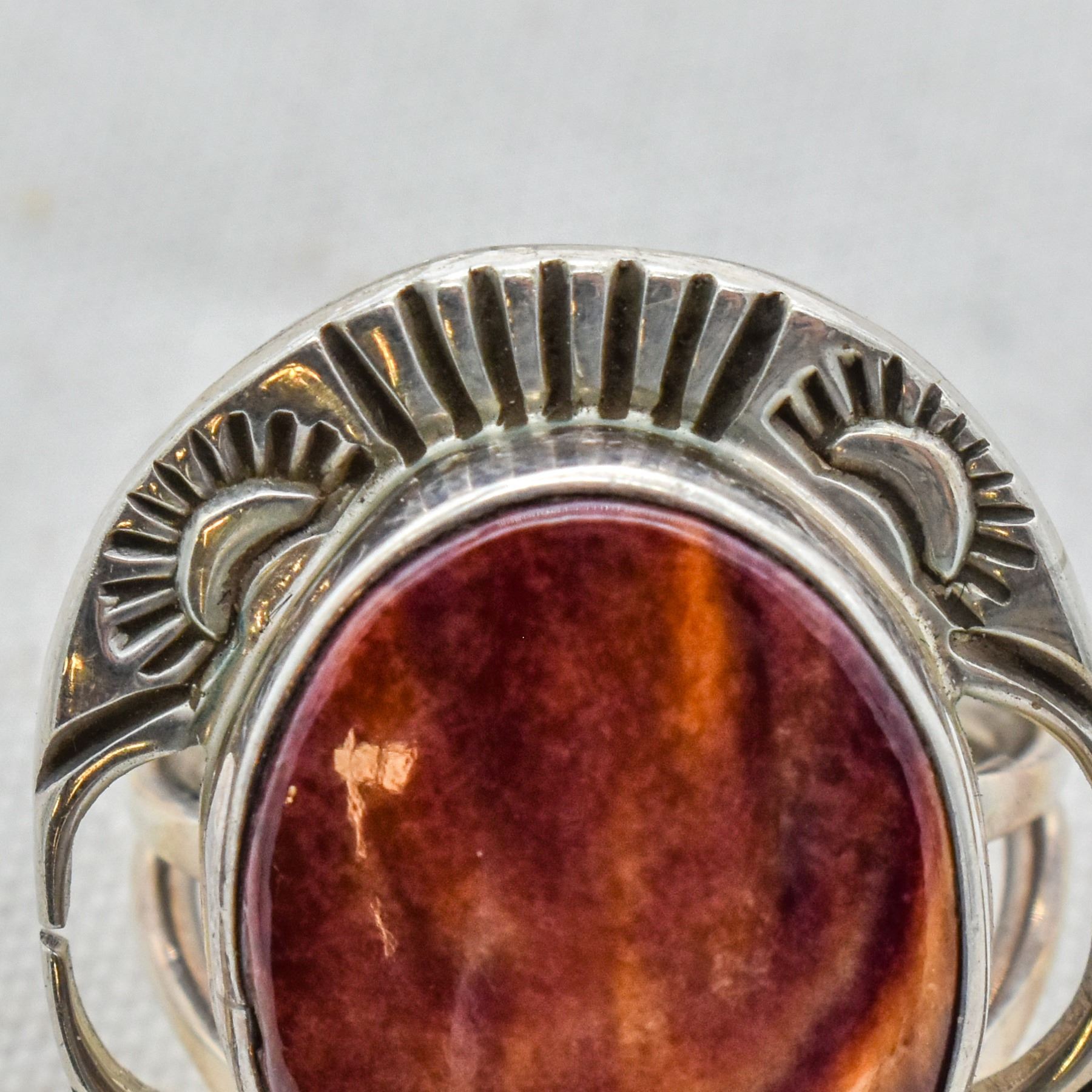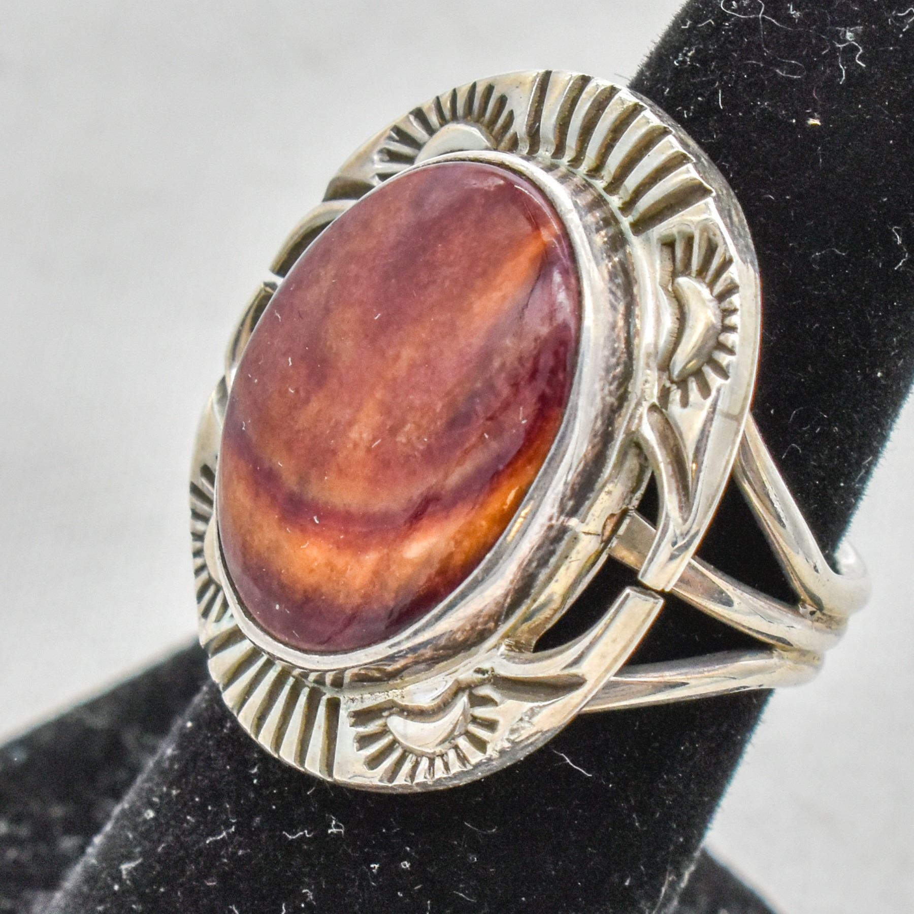 Native American Navajo Sterling Purple Spiny Oyster Shell Ring by Joe Paul, Size 7.75, engraved signature on back, measures 1.25''L x 1''W