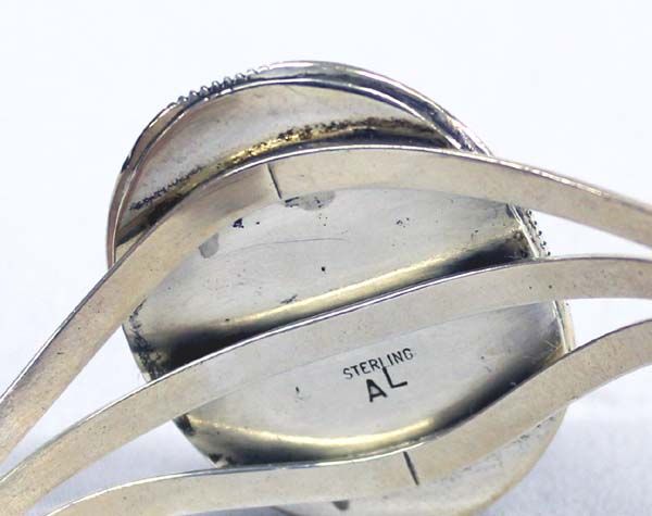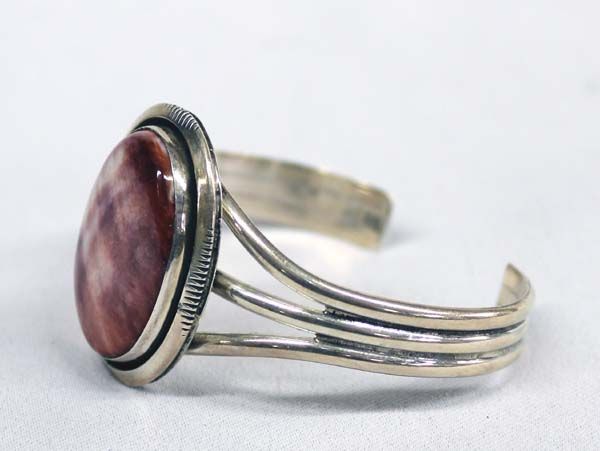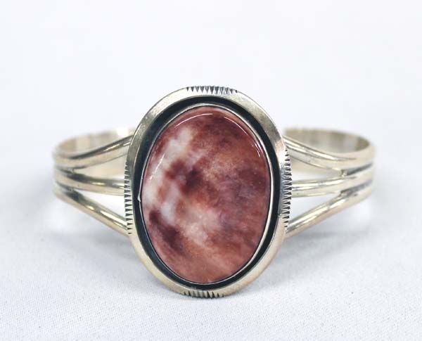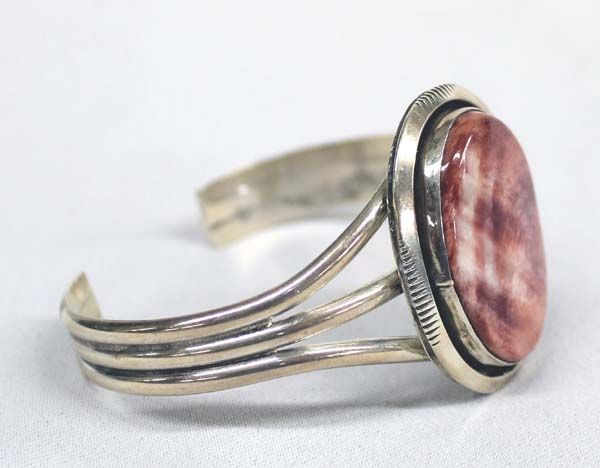 Navajo Sterling Red Shell Bracelet by Augustine Largo, hallmarked AL and stamped sterling, inside measures 6.5'' which includes opening x 1.5''W, features lovely red shell cabochon measuring 1 1/8''L x 7/8''W, carved edging, 3 band bracelet which tapers down into one, 33.11g in total wt.