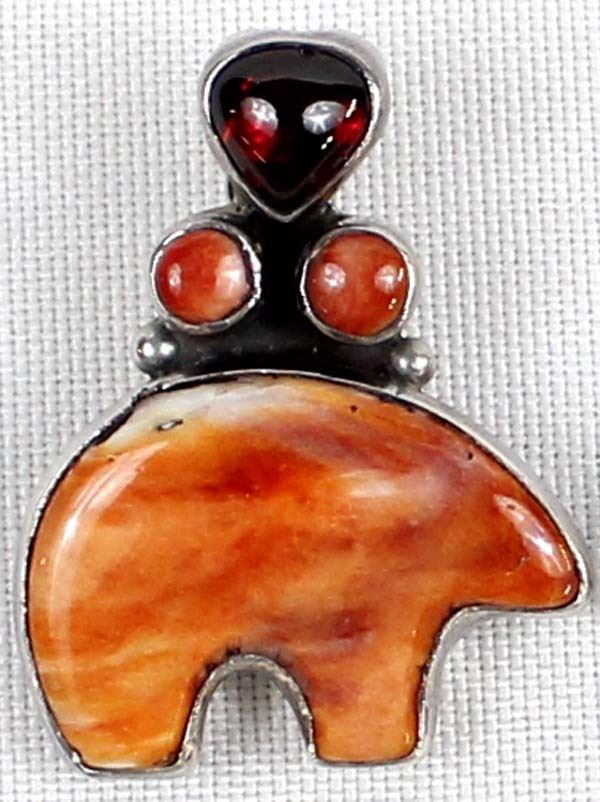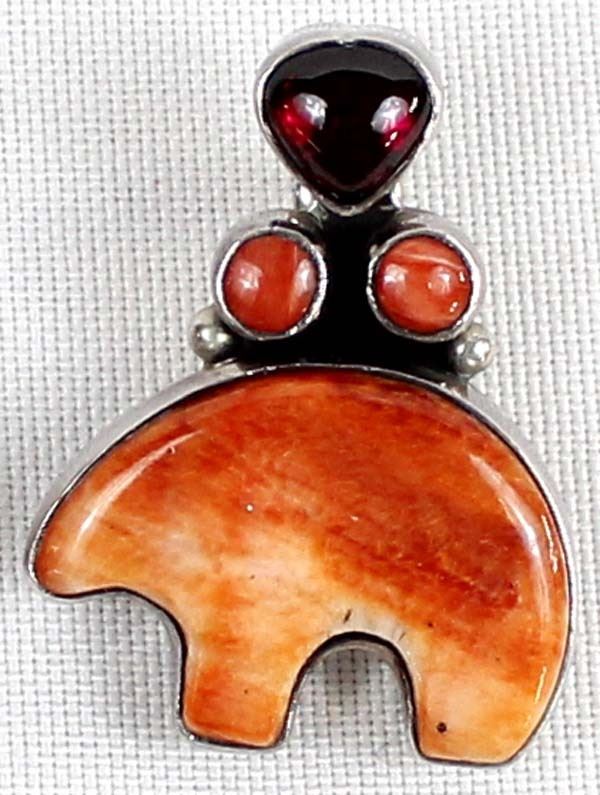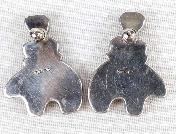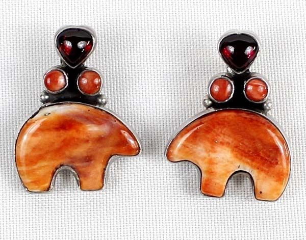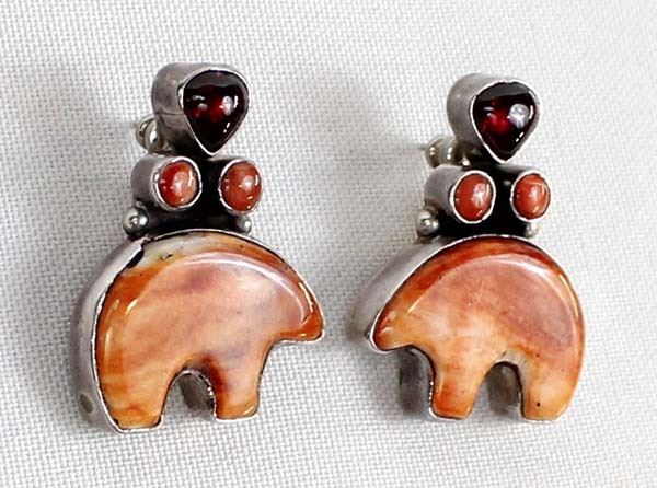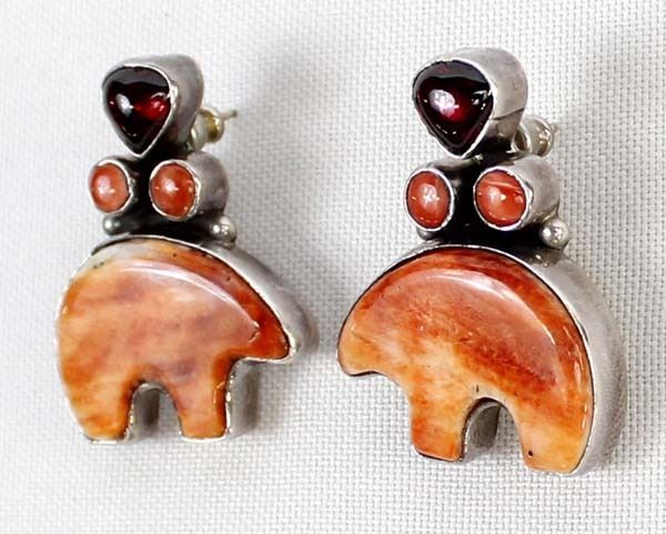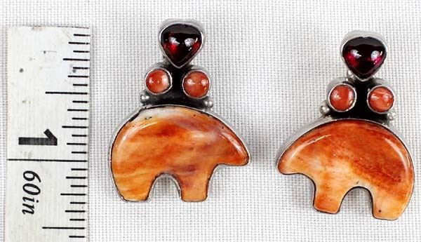 Native American Navajo Sterling Red Shell Medicine Bear & Garnet Earrings, measure 1.5'' x 1.25'', stamped sterling