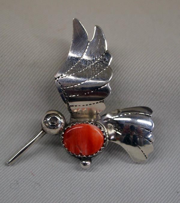 Native American Navajo Sterling Redshell Hummingbird Pin - Louise Yazzie. Measures approx. 1 1/2''H x 1 1/2''W. Delicate and pretty little hummingbird.