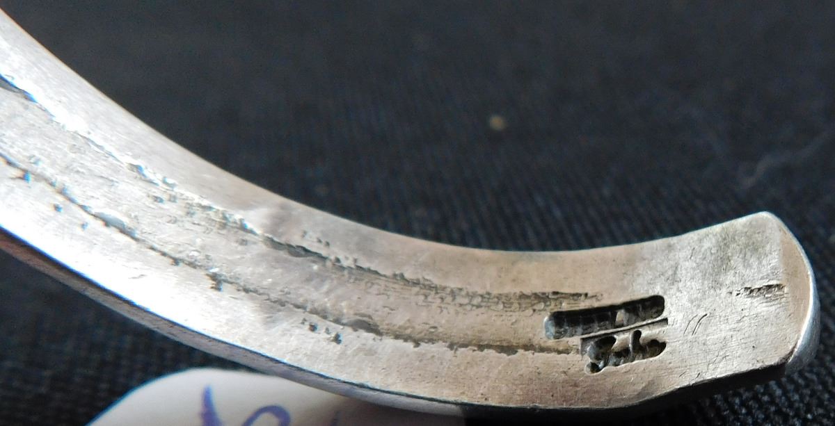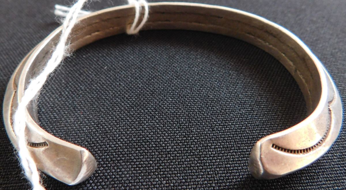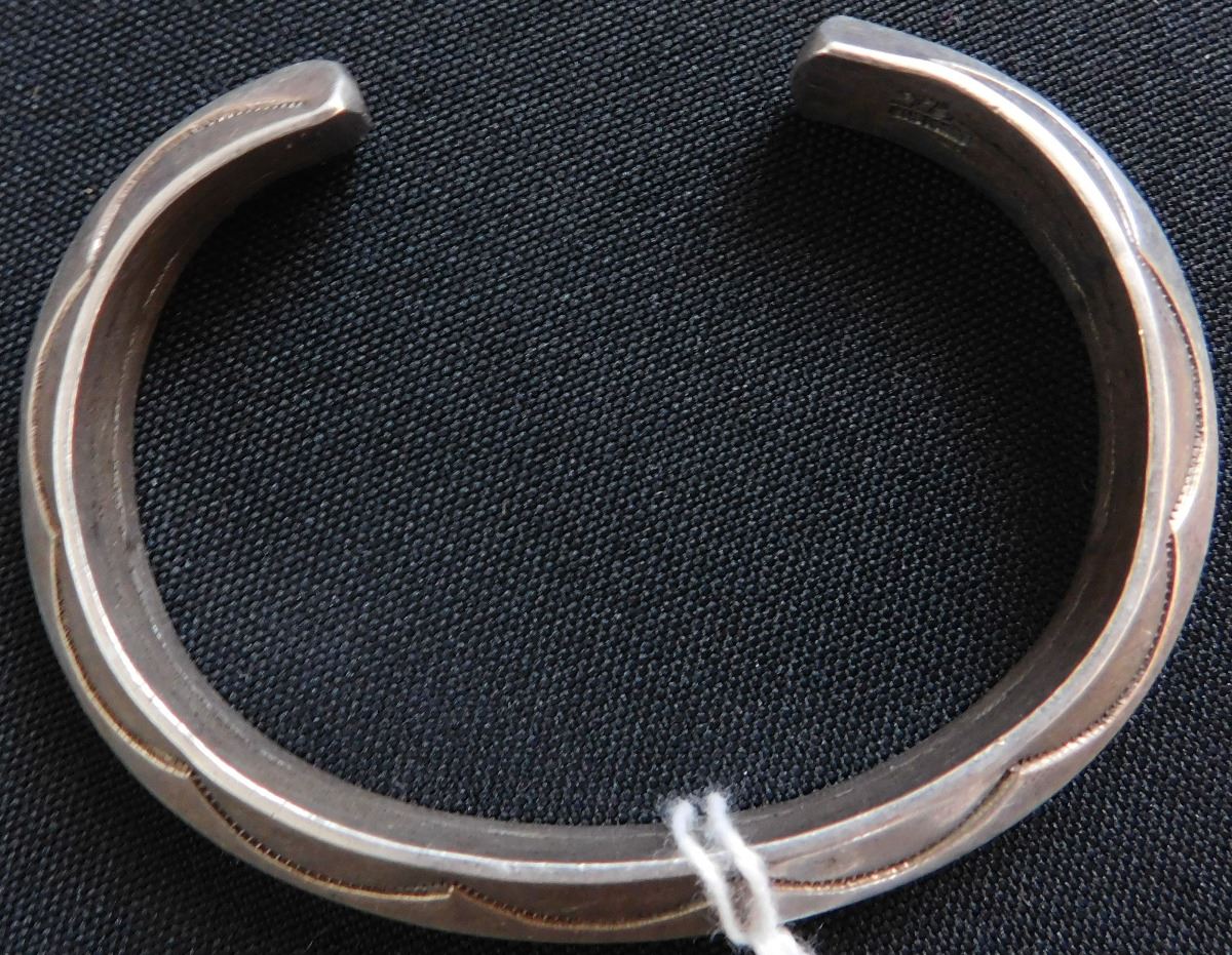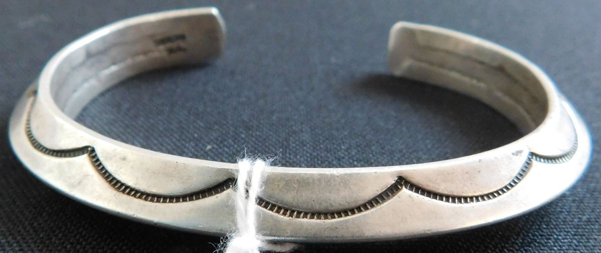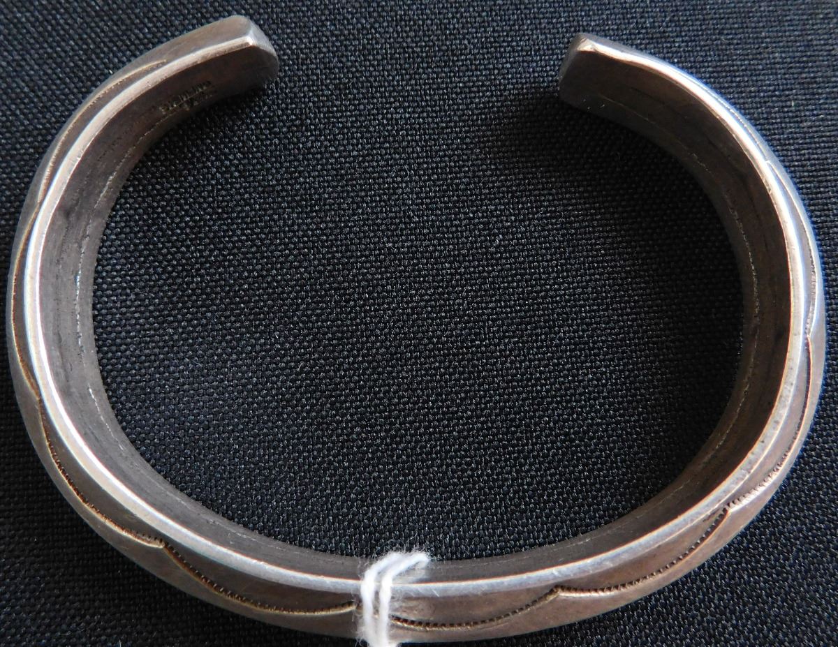 Navajo Sterling Silver Bracelet, circa 1940s. Made of sterling silver and measuring 7 1/4 around with an opening of 1.25". Navajo, Arizona. Signed and possibly reads "Jake" by sterling mark. Condition: Worn but good, see images. Shipping: $15.50.