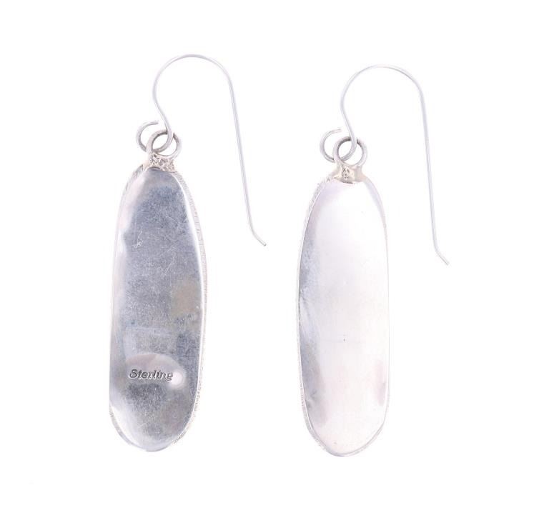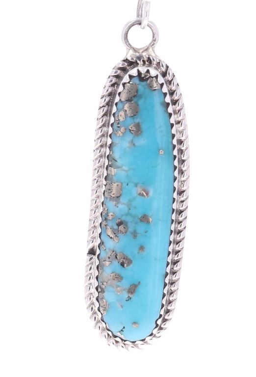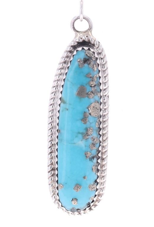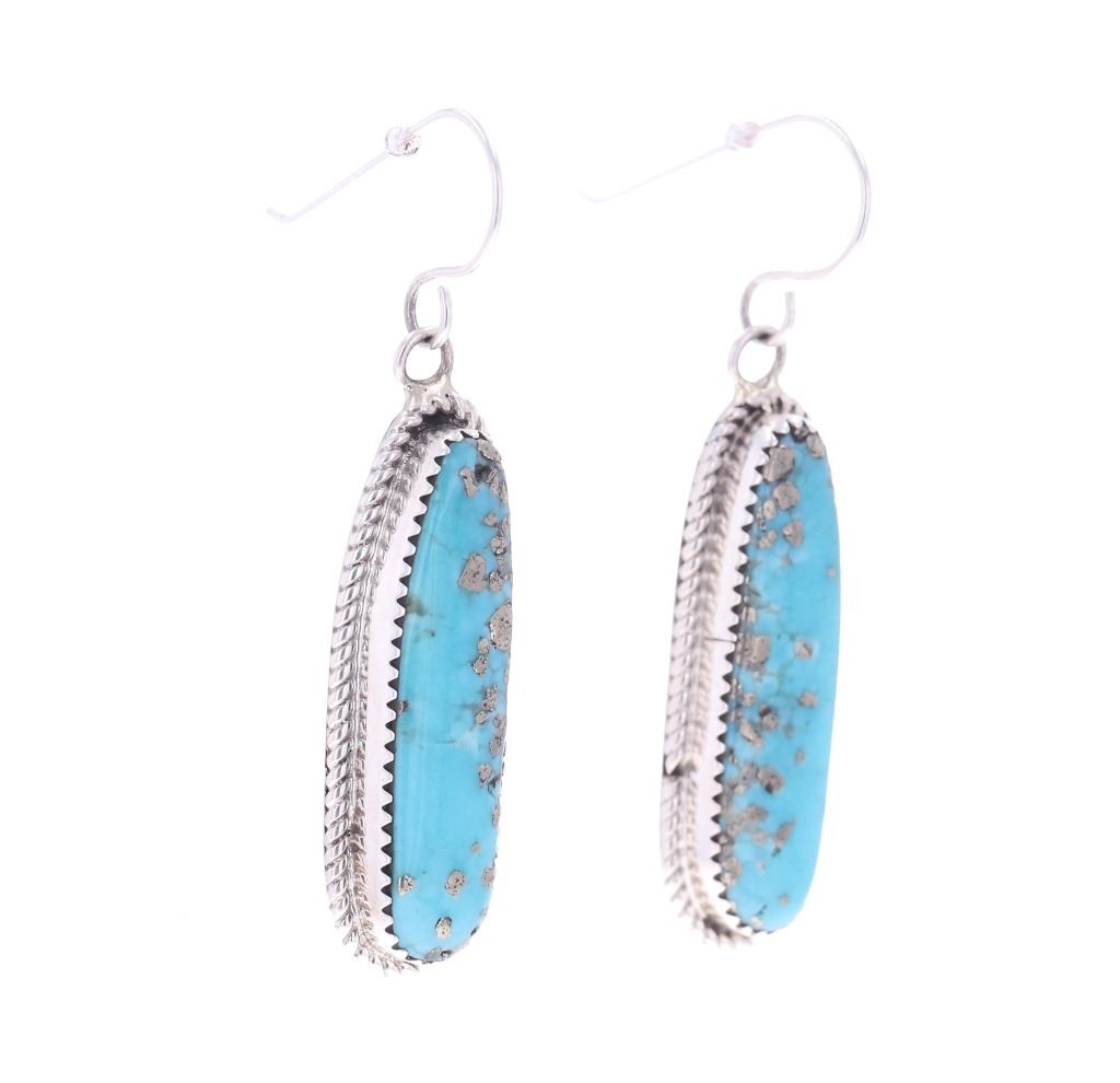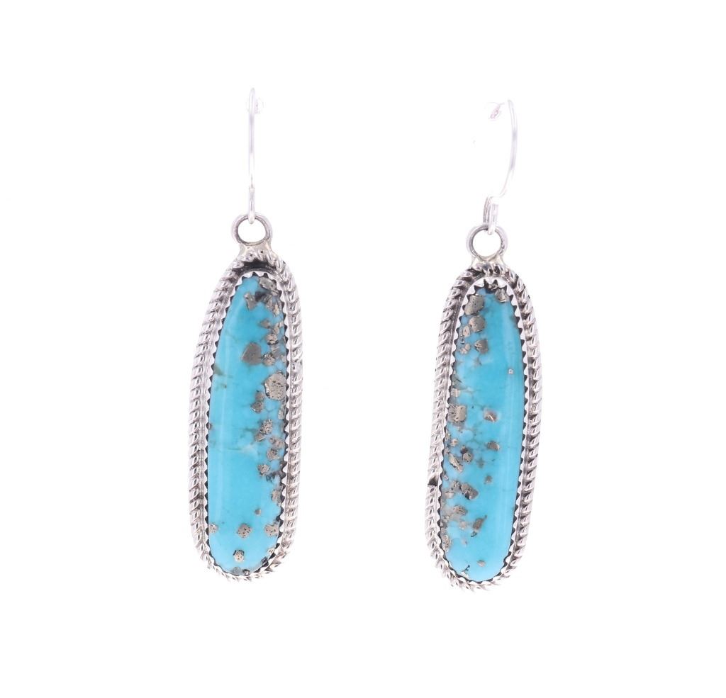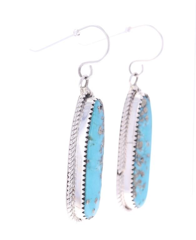 Featured in this lot is this Navajo sterling silver and cripple creek turquoise earrings. The earrings shows wonderfully and professionally crafted sterling silver and turquoise construction that shows a twisted rope border and shows oval cut Kingman turquoise set in to the dangle earrings. The earrings are marked 'sterling' on the back of the dangle earrings. The condition of this pair of earrings is good with no obvious signs of damage and shows good overall condition. The measurements of this pair of earrings is 2 1/8" x 1/2" x 5/8". The collective weight of this pair of earrings is 13.1g.