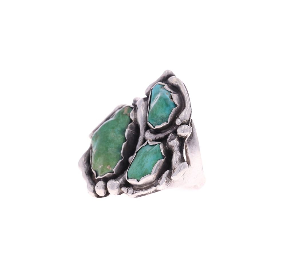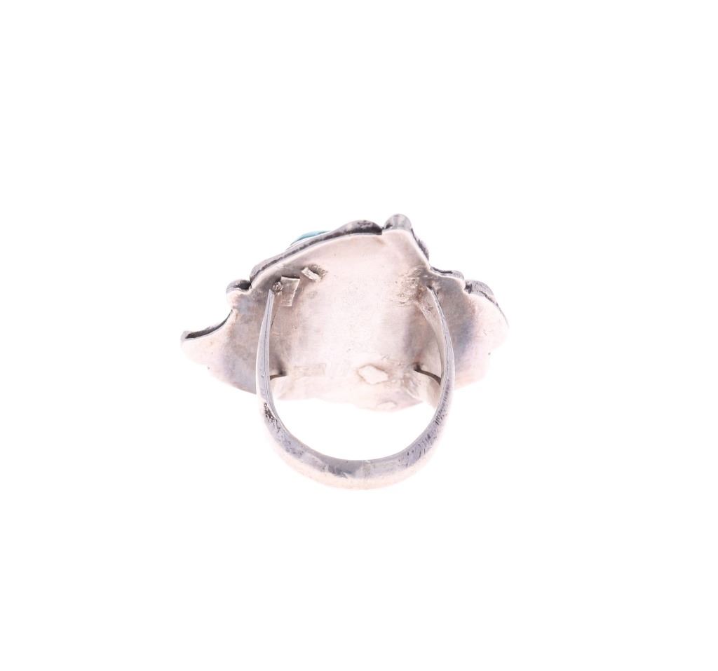 Featured in this lot is this Navajo sterling silver Carico Lake Turquoise ring circa 1950's to 1970's. The ring features a wonderfully and professionally crafted sterling silver and Carico Lake Turquoise construction that shows a three stone setting with natural Carico Lake Turquoise set into the face of the ring with molten sterling silver around the stones. The condition of this Navajo ring shows one of the connecting split shoulders of the ring band detached from the ring body. The measurements of this ring is 1 1/8" x 1 1/2" x 1 1/2". The collective weight of this ring is 20.6g.