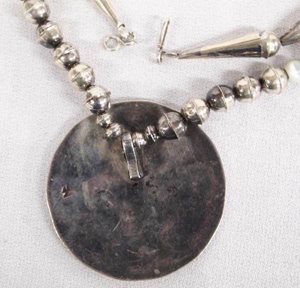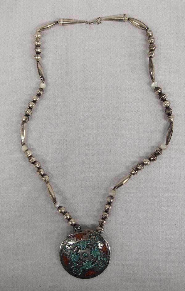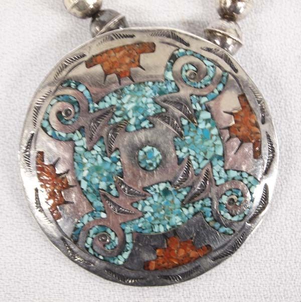 Navajo Sterling Silver Chip Inlay Necklace by Charlie Singer, older necklace of sterling silver beads and a pendant set with chip turquoise and coral, measures 27'' end to end and pendant measures 2'', 58g in total wt.
