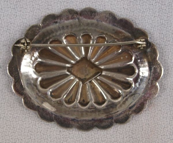 Navajo Sterling Silver Concho Pin, measures 2''L x 1.5''W, beautiful hand stamping, a fine example of traditional Navajo silversmithing