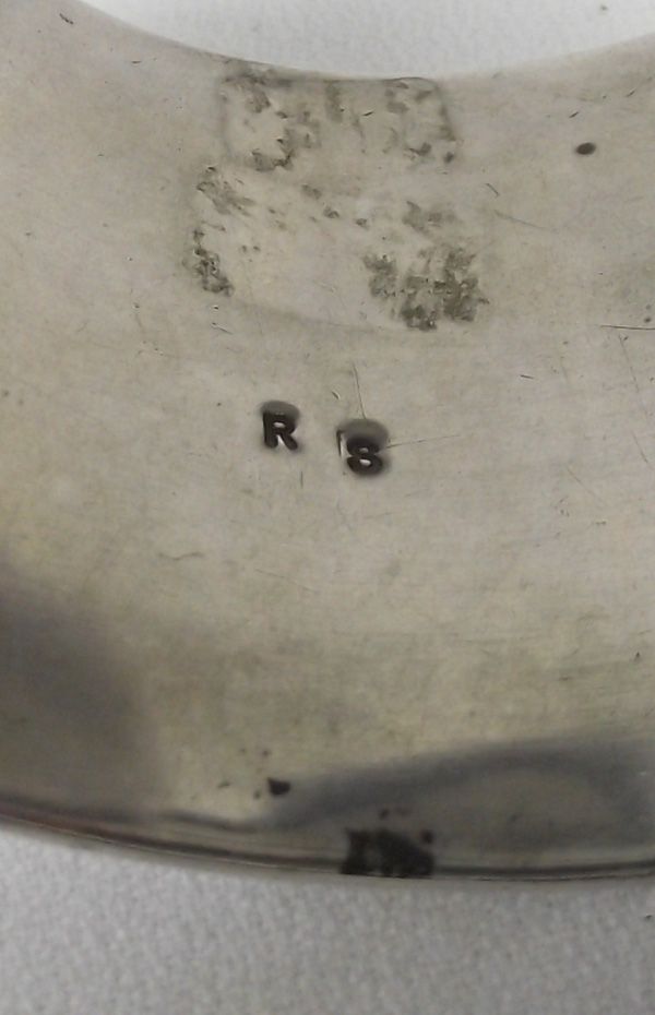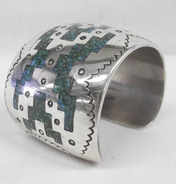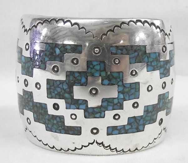 Navajo Sterling Silver Crushed Turquoise Bracelet hallmarked RS, features stairstep cloud inlay designs of crushed turquoise, hand stamped scalloped edging, heavy silver, inside measures 6.75in x 2in W, an exceptional piece