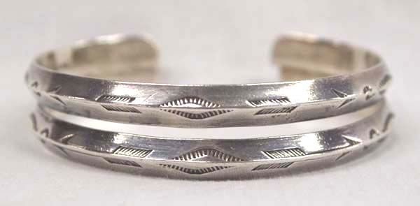 Navajo Sterling Silver Cuff Bracelet, inside measures 6'' which includes opening x .5''W, stamped sterling and hallmarked with a kachina hallmark, features gorgeous hand stamping, double band bracelet, 26g in total wt.