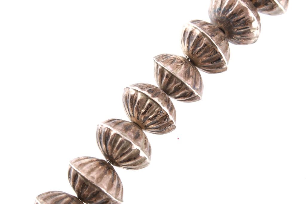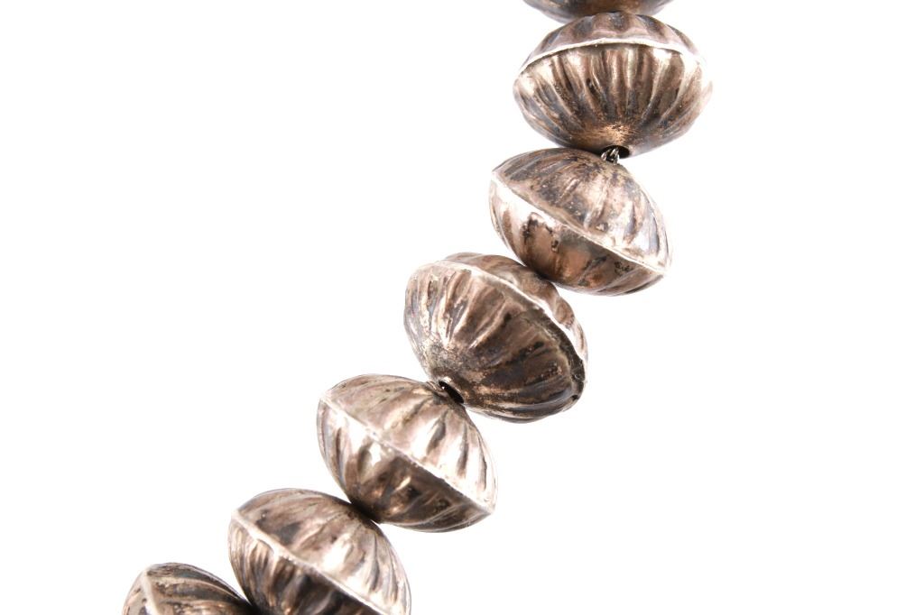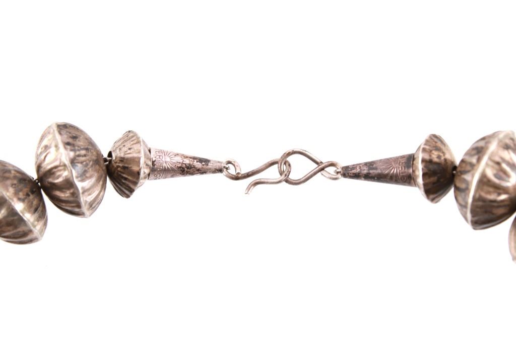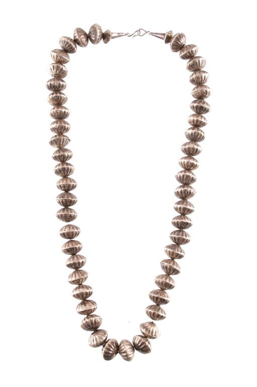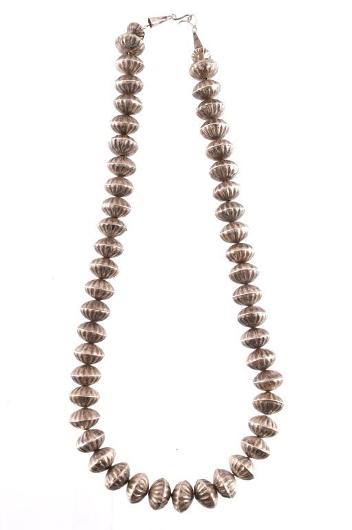 Featured in this lot is this Navajo sterling silver embossed beaded necklace circa 1940's. The necklace features 49 total sterling silver beads on a chain. The beads feature wonderfully and professionally crafted construction with embossed decoration and is graduated from a smaller bead to a larger bead around by the clasps and the aglets feature a sunburst hallmark with 'sterling' stamps underneath. The condition of this necklace is good with no obvious signs of damage and in good overall condition. The measurements of this necklace from clasp to clasp are 23 1/4" and the beads measure3/4" in diameter. The necklace weighs 79g.