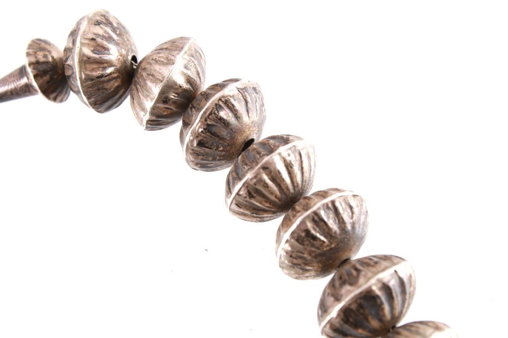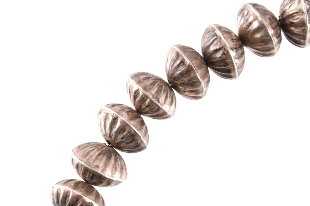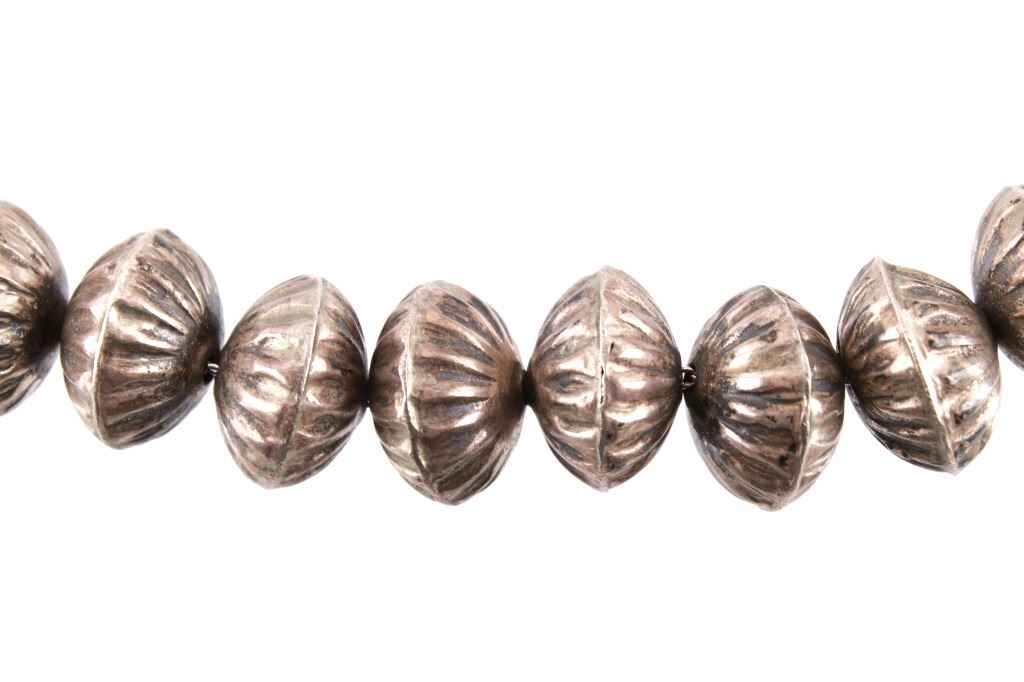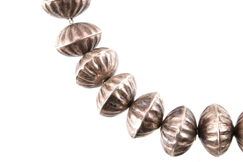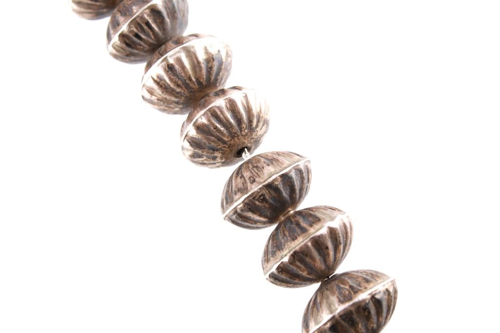 Featured in this lot is this Navajo sterling silver embossed beaded necklace circa 1940's. The necklace features 49 total sterling silver beads on a chain. The beads feature wonderfully and professionally crafted construction with embossed decoration and is graduated from a smaller bead to a larger bead around by the clasps and the aglets feature a sunburst hallmark with 'sterling' stamps underneath. The condition of this necklace is good with no obvious signs of damage and in good overall condition. The measurements of this necklace from clasp to clasp are 23 1/4" and the beads measure3/4" in diameter. The necklace weighs 79g.