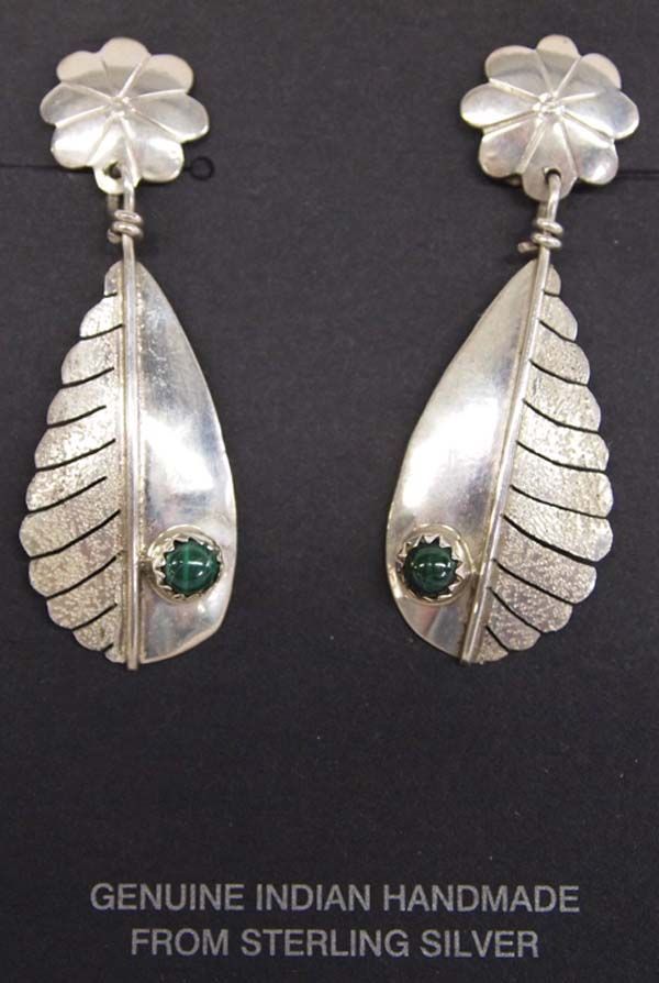 Navajo Sterling Silver Feather Malachite Clip On Earrings. These earrings measure approx. 2''L x .5''W, 5.64g in total wt.