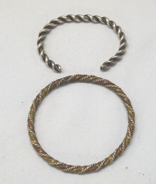 From the Tucson, Arizona Collection. Navajo Sterling Silver Guard and Bangle Bracelets, #1 Sterling wrapped around copper bangle, measures 2 5/8''D x 1/8''W, 19.5g in wt, #2 Twisted Silver Guard Bracelet, inside measures 6'' which includes opening x 1/8''W, 16.5g in wt