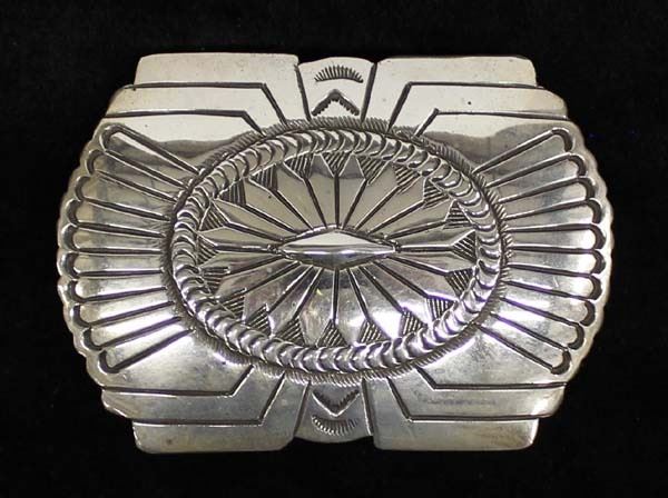 Native American Navajo Sterling Silver Hand Stamped Buckle, hallmarked M (possibly by Morris Begay) and stamped sterling, phenomenal workmanship in this traditional piece, measures 2.5'' x 3.5'', 66.54g in total wt.