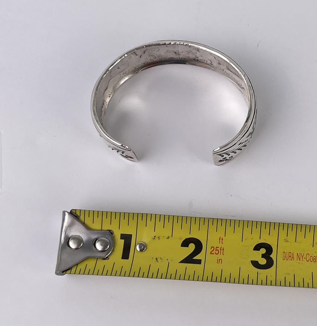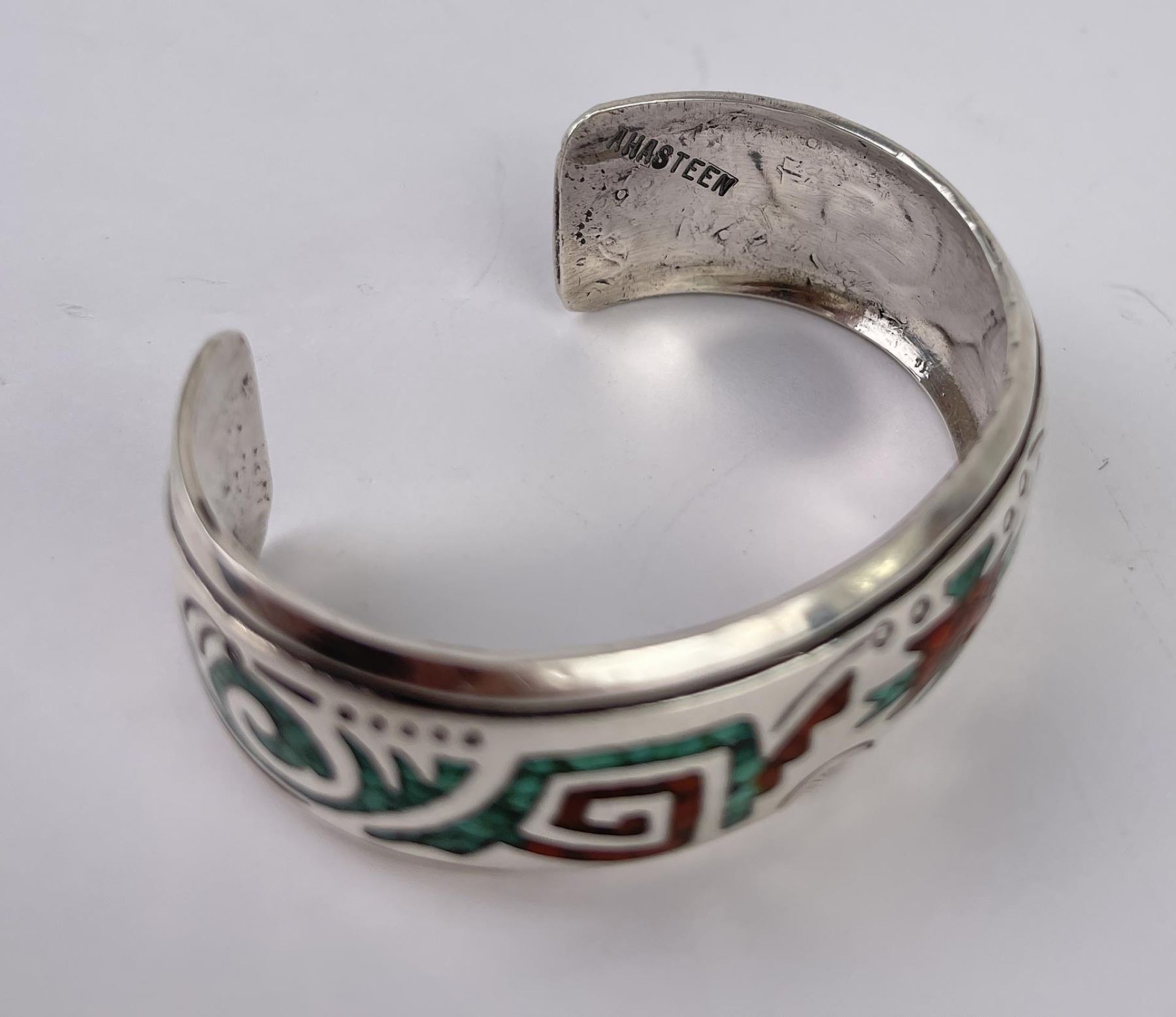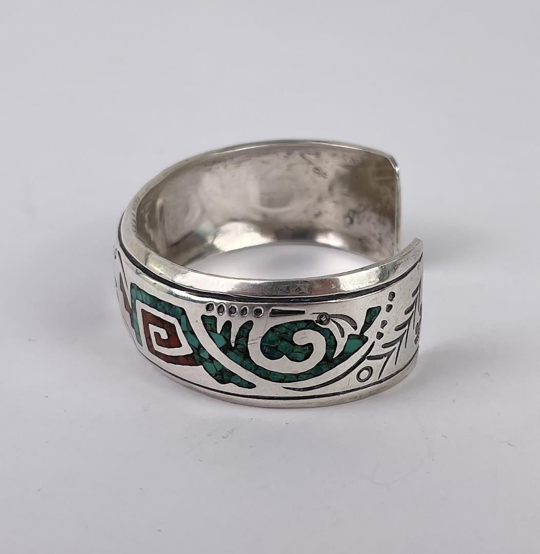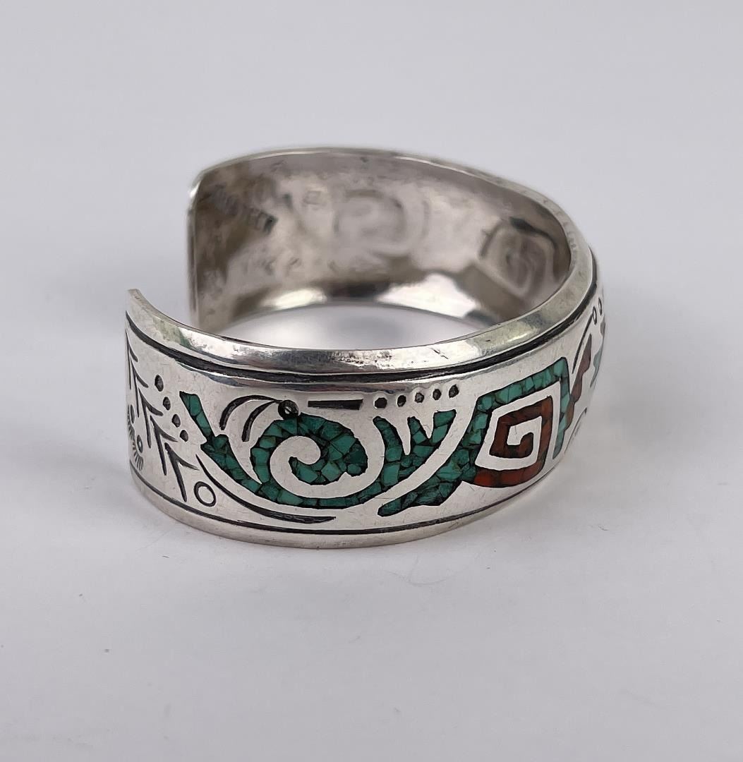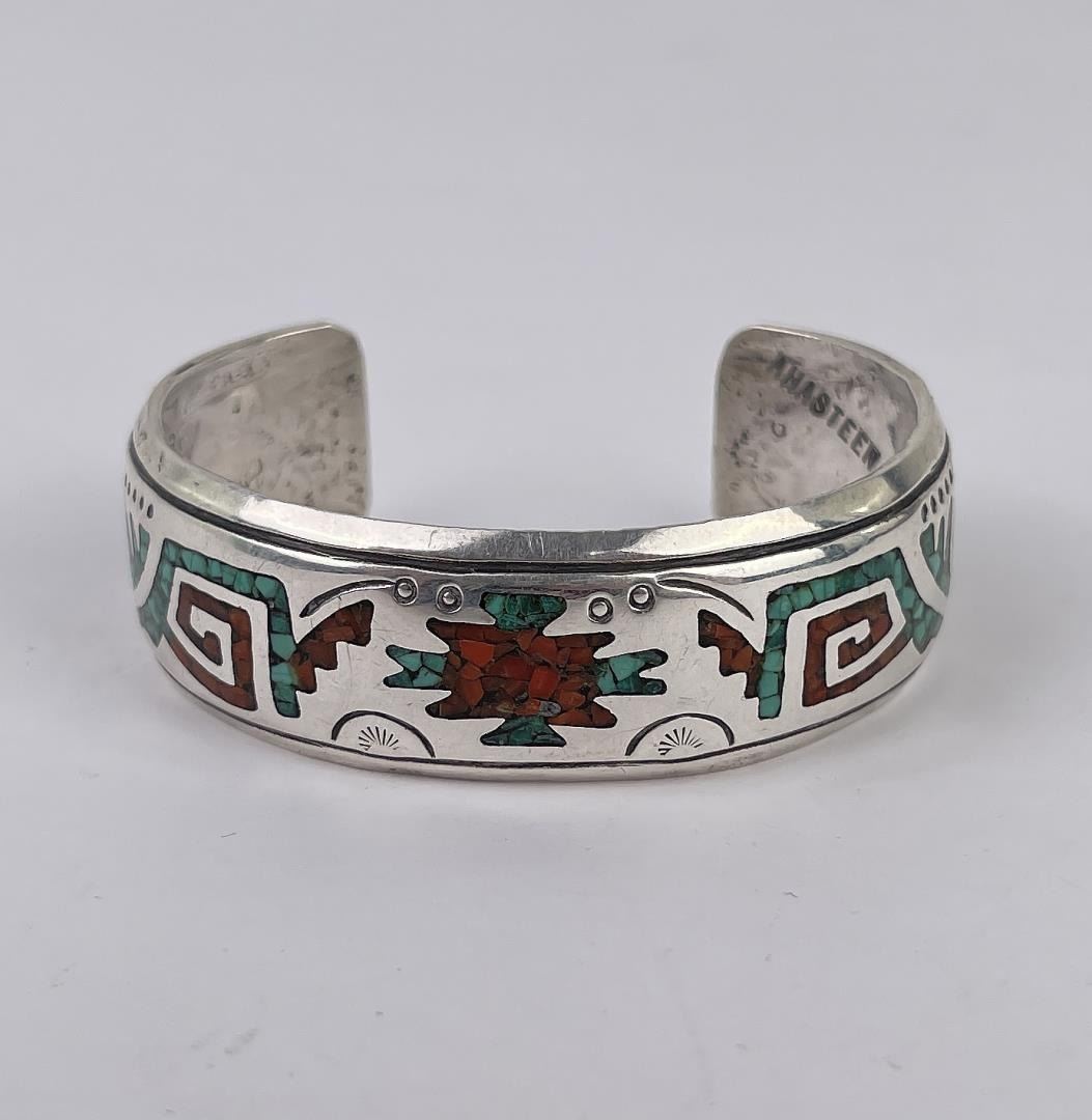 Very nice bracelet. Signed as shown. Inlaid with Coral and Turquoise.
