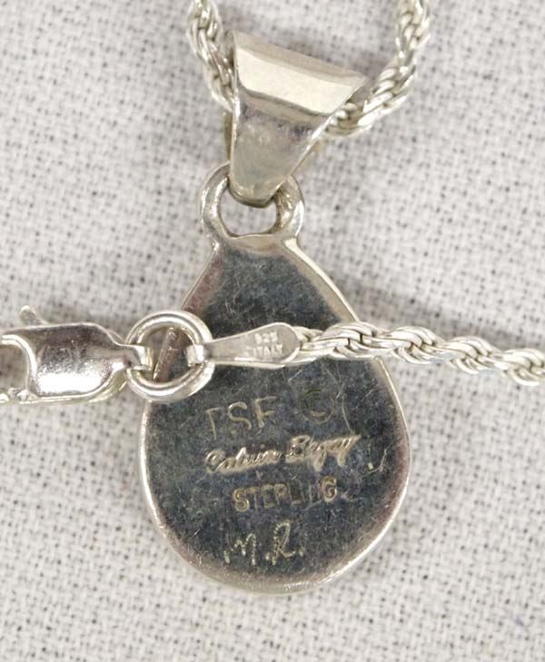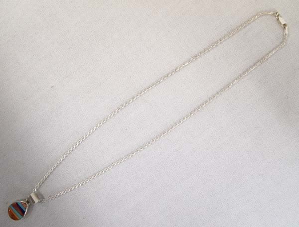 Native American Navajo Sterling Silver Inlay Necklace by Calvin Begay, beautiful stone to stone inlay (turquoise, sugilite, and red shell) set in sterling silver, hallmarked Calvin Begay, pendant measures 1'' and the sterling rope chain measures 17'' end to end, 10.3g in total wt.