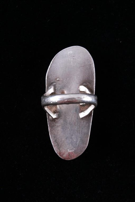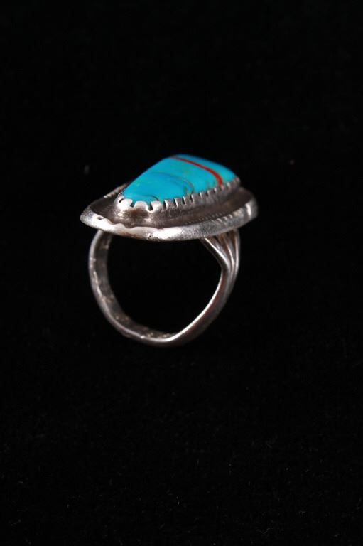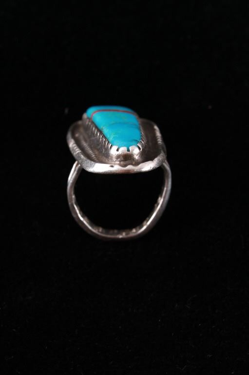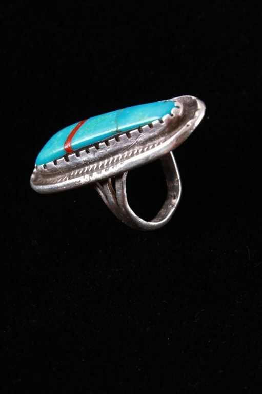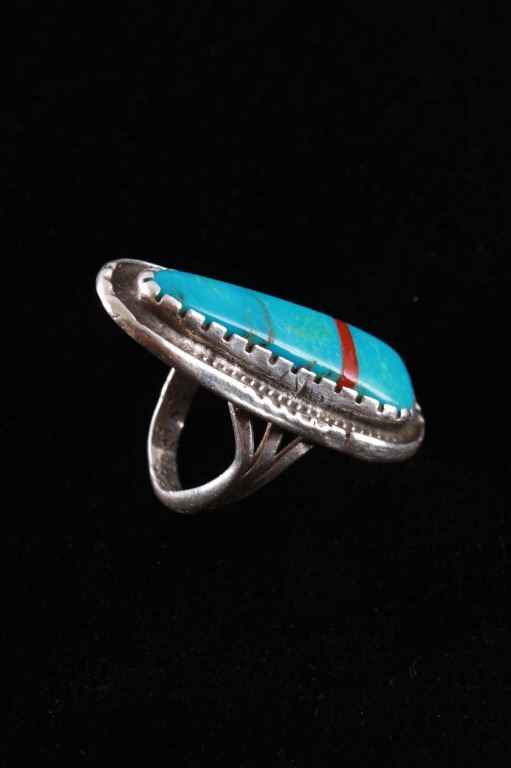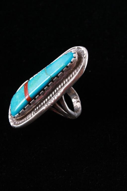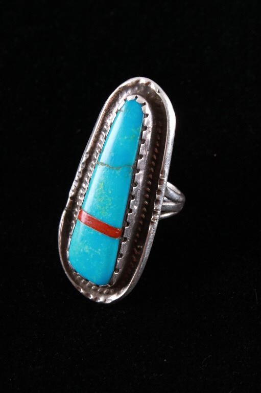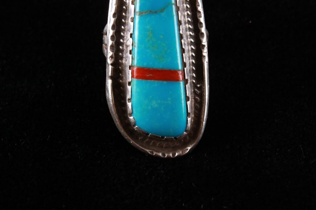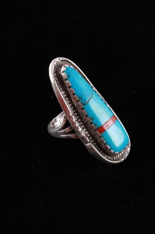 Featured in this lot is this Navajo sterling silver and Kingman turquoise, red branch coral ring. The ring features a wonderfully and professionally crafted sterling silver construction that features a twisted rope border and shows a large segment of inlaid Kingman turquoise cabochon set with a strip of red branch coral cabochon set into the cross section of the ring. The condition of this ring is good with no obvious signs of damage and in good overall condition. The overall measurements of this ring is 1 1/8" x 1 7/8" x 7/8" and shows a ring size of US 9. The overall weight of this ring is 17.6g.