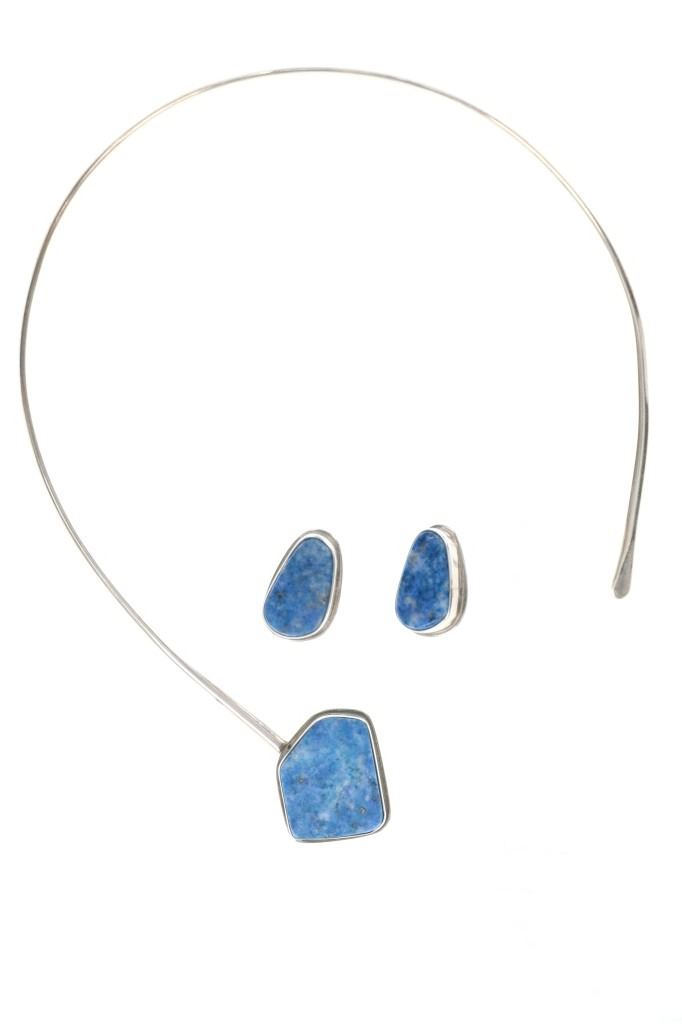 Featured in this lot is a set of Navajo sterling silver lapis lazuli jewelry. There is a necklace and a pair of earrings in this set. They both feature a professionally crafted sterling silver and lapis lazuli construction that shows a fixed necklace with a polygonal lapis lazuli cabochon. The earrings are set using two semi-triangular lapis lazuli cabochon. Both the necklace and earrings are marked as follows: I-PAUL - Sterling. The condition of this set of Navajo jewelry is well preserved with no obvious signs of damage and shows a well preserved condition. The measurements of this necklace are 7 1/8" x 6" and the internal measurements are 14 1/2" and the gap measures 3", and the earrings measure 1 1/8" x 5/8". The collective weight of this set is 34g.*