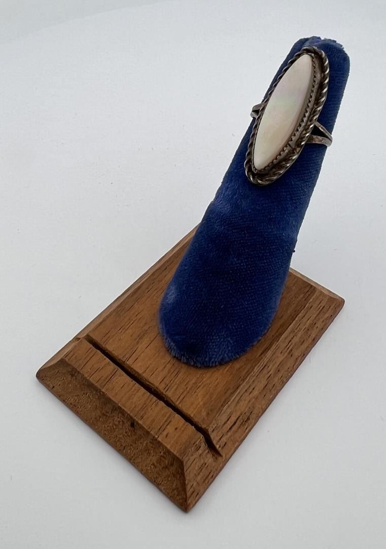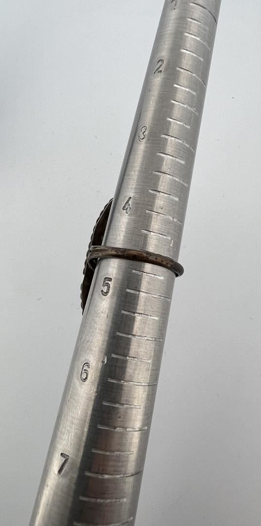 Nice oblong shape, coiled rope designed setting. Split band, size 4 1/2