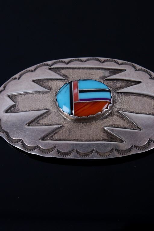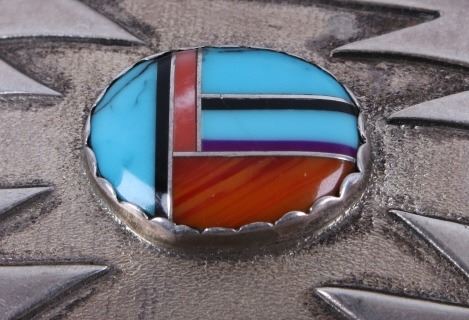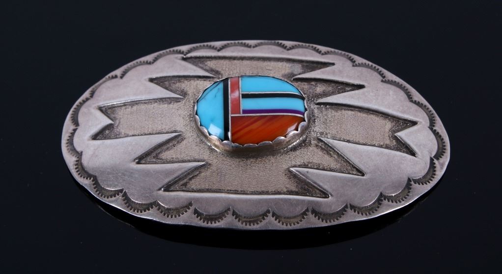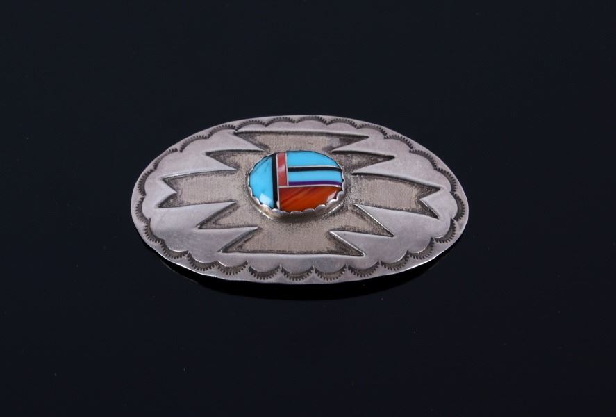 Offered for your bidding pleasure is this Navajo Native American Sterling Silver & Multi Stone Brooch. This brooch displays several polished stones such as Sleeping Beauty Turquoise, Branch Coral and Jet. The brooch displays excellent stamped design to the front and is stamped "Sterling" to affirm its quality. It measures 2 1/2" wide by 1 1/2" tall.