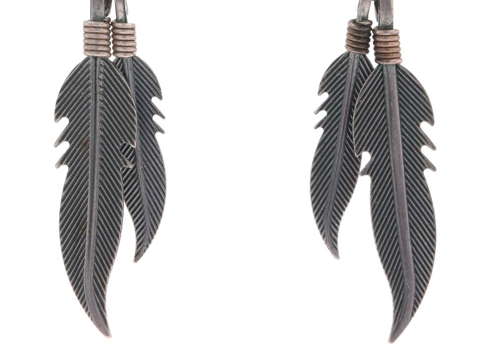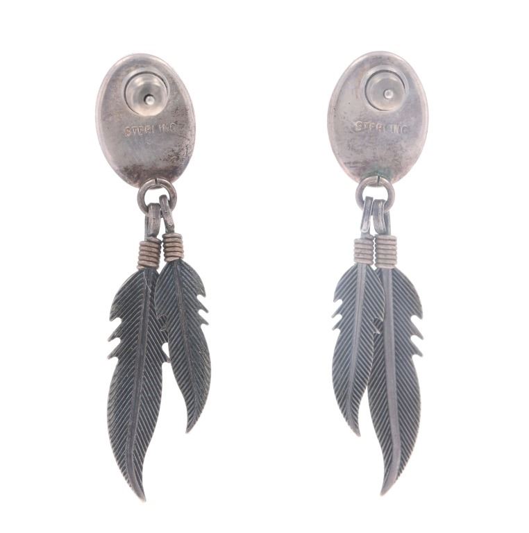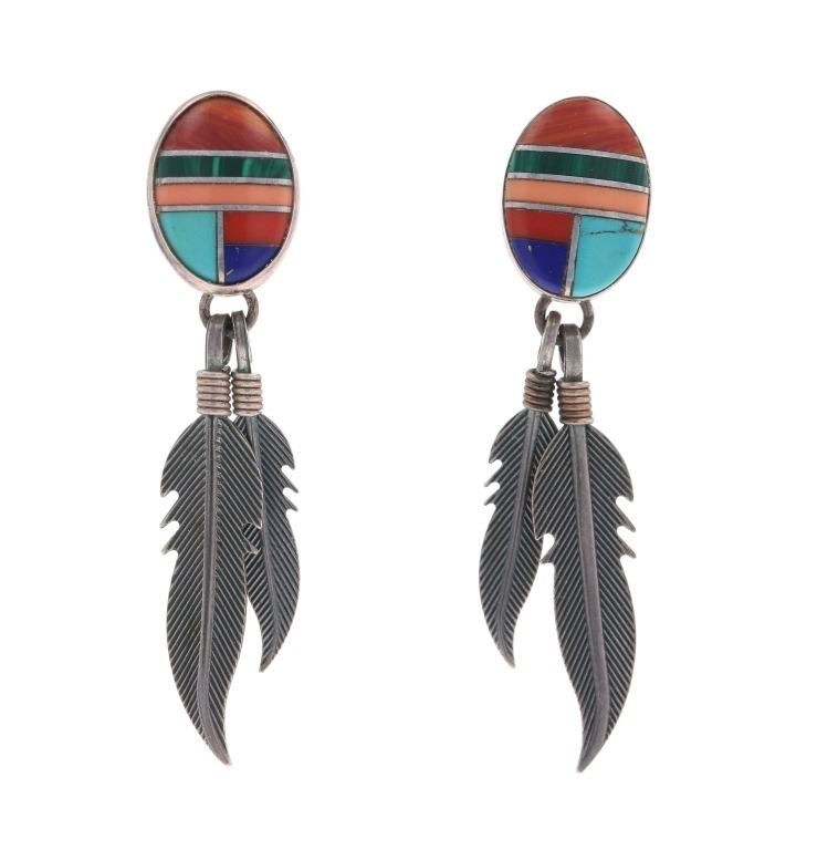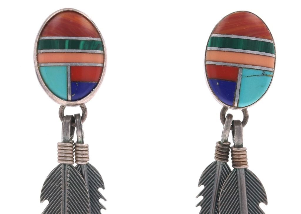 Featured in this lot is this pair of Navajo sterling silver multistone inlaid mosaic earrings. The earrings feature wonderfully and professionally crafted sterling silver design with drop sterling silver feathers and featured on the face of the stud earrings is a multistone inlaid mosaic including the following stones: red branch coral, malachite, spiny oyster, and turquoise. The earrings feature 'sterling' stamps on the backside of the earrings. The condition of these earrings is good with no obvious signs of damage and in good overall condition. The measurements of these earrings are 1 3/4" x 3/8" x 1/2". The collective weight of these earrings are 5.8g