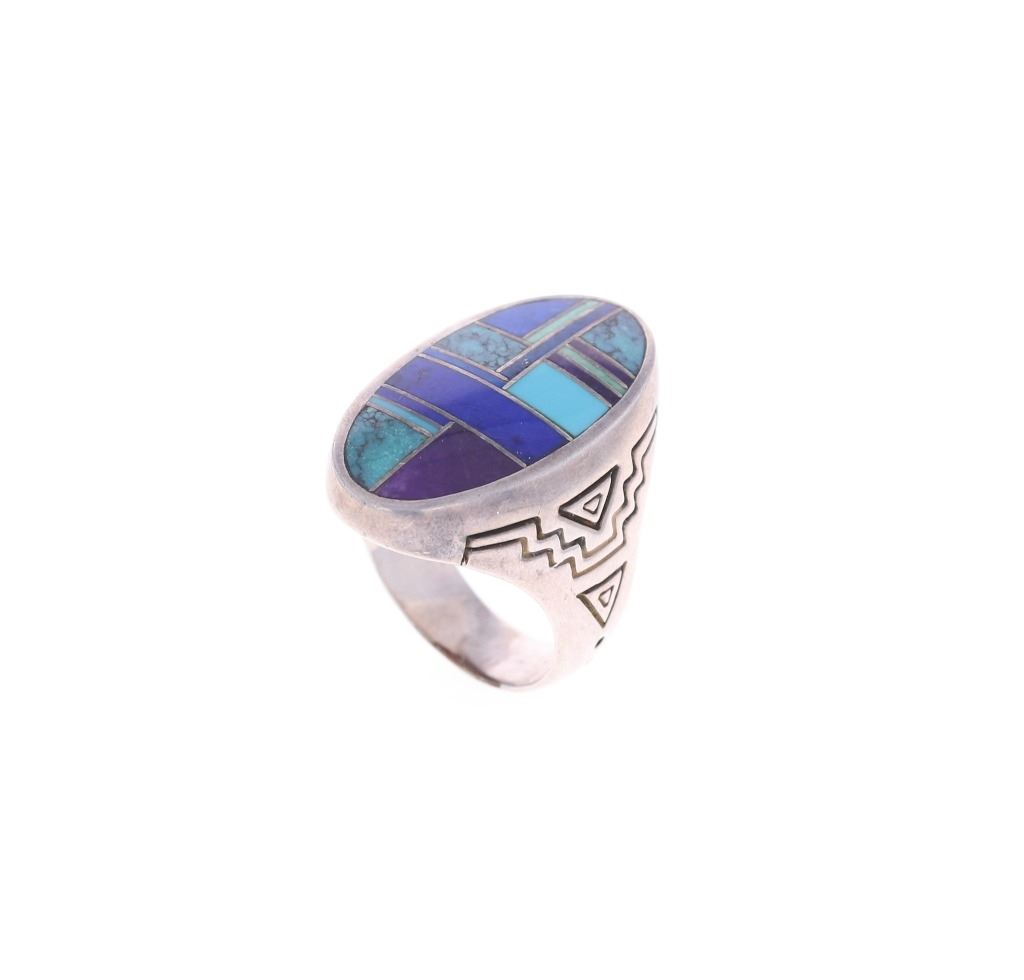 Featured in this lot is this Navajo sterling silver multistone mosaic ring circa 1960's. The ring features a wonderfully and professionally crafted sterling silver and multistone construction. The ring features a inlaid mosaic design that shows geometric cabochon that includes sleeping beauty turquoise, Kingman turquoise, Lapis Lazuli, and Charoite. The shoulders of the ring shows etched geometric patterns. The condition of this Navajo ring is good with no obvious signs of damage and shows good overall condition. The measurements of this ring is 1" x 1 1/8" x 7/8". The collective weight of this ring is 19.1g. The ring size is US 10.