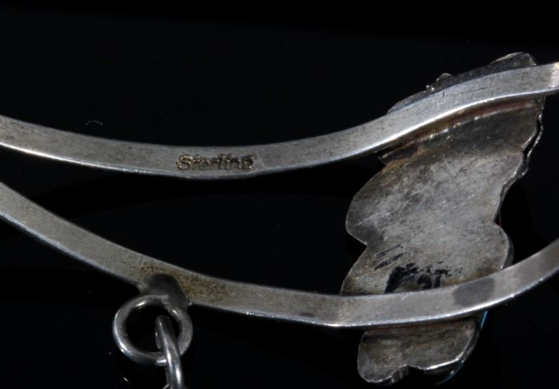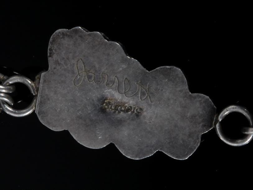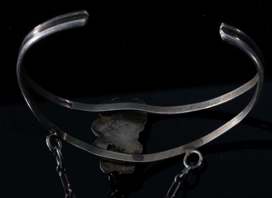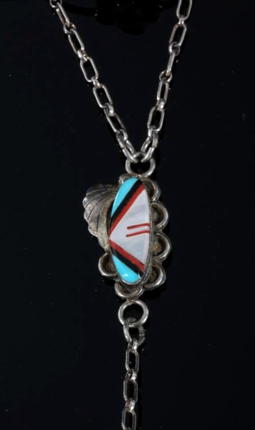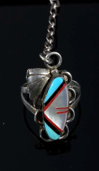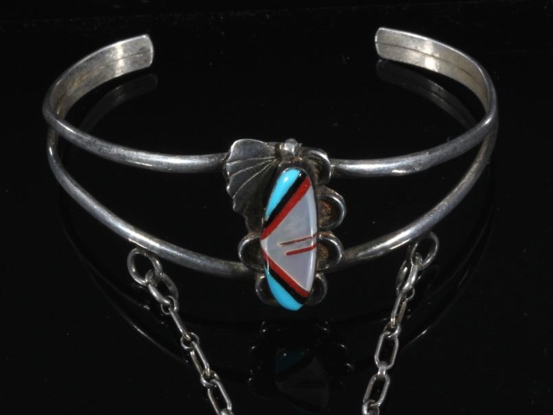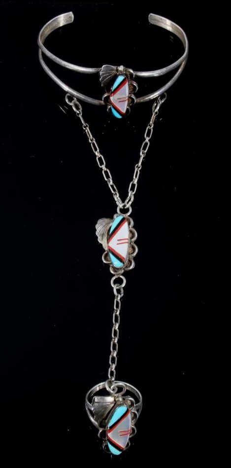 Available in this lot is a Navajo Native American Indian, sterling silver, turquoise, mother of pearl, onyx and coral slave chain bracelet. The bracelet shows three identical charms, all with three beautiful nuggets of mother of pearl, inlaid with coral and onyx with a turquoise border set tightly into the sterling silver base. The charms also show wonderful silver accents one on each corner of the charms. The charms are identical in design. The bracelet shows good condition, with a nice silver patina. It is signed and marked sterling on the underside of the middle charm. The chain measures 7.75 " long overall, the ring is a US size 8, and the inside circumference of the bracelet equals approximately 6.25".