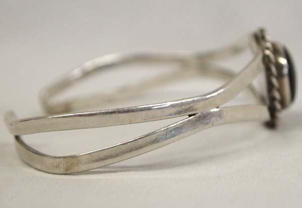 Native American Navajo Sterling Silver Onyx Bracelet, inside measures 7.75'' which includes opening x 1''W, 25.27g in total wt., end of band needs resoldering