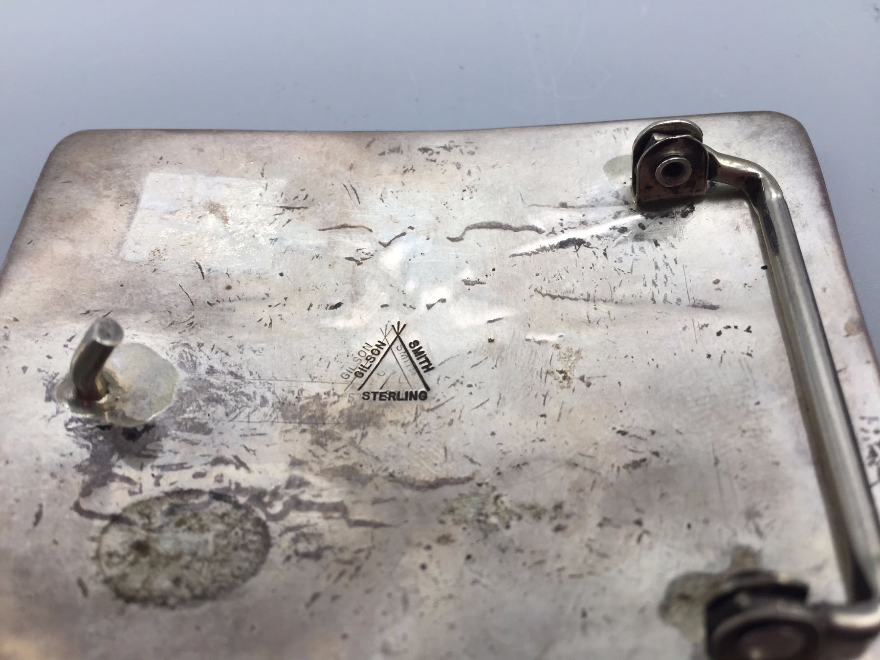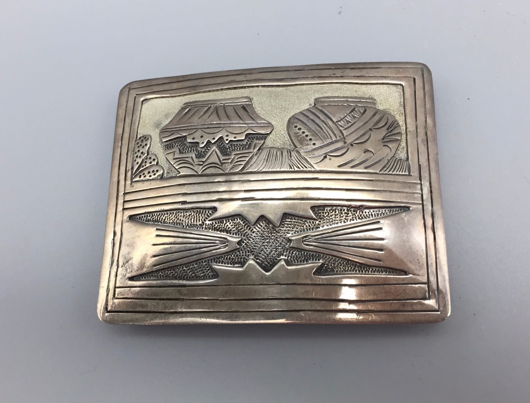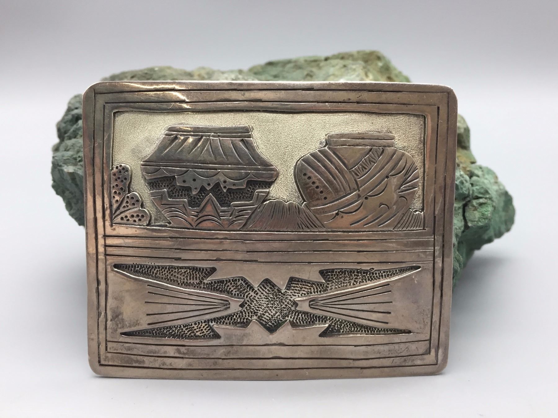 Maker: Gilson Smith, Navajo. Approx. Age: Circa 1980s. Size: Measures 3” w 2 3/8” h. Weighs 52 g. Additional Info: Sterling silver overlay with designs. Condition: Good for it’s age, normal wear expected. Please look closely at the pictures - they are an important part of our description. Shipping: There will be a $5 handling / packaging fee for shipping this lot. The actual cost of postage will be added on top of that.