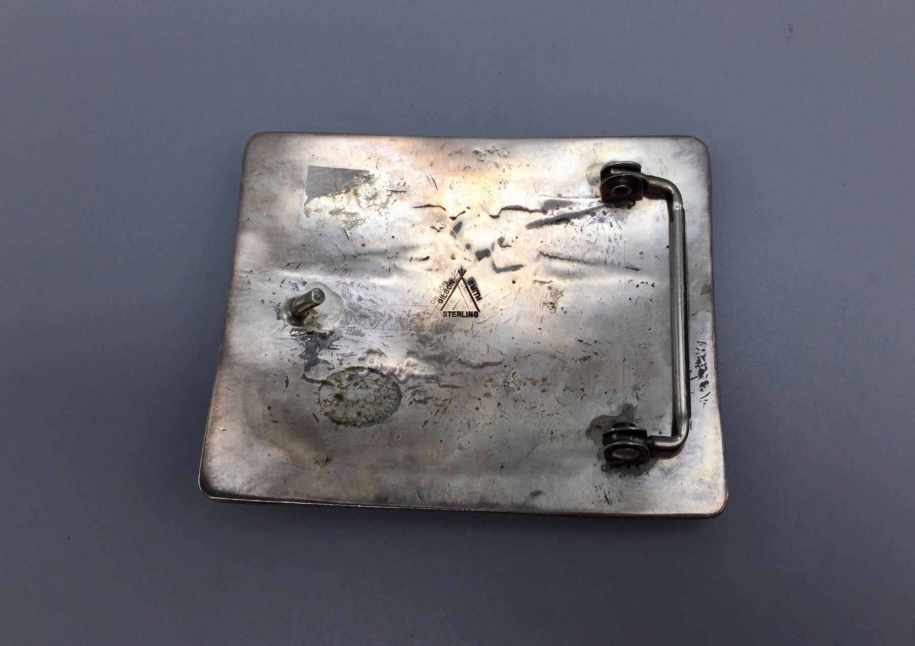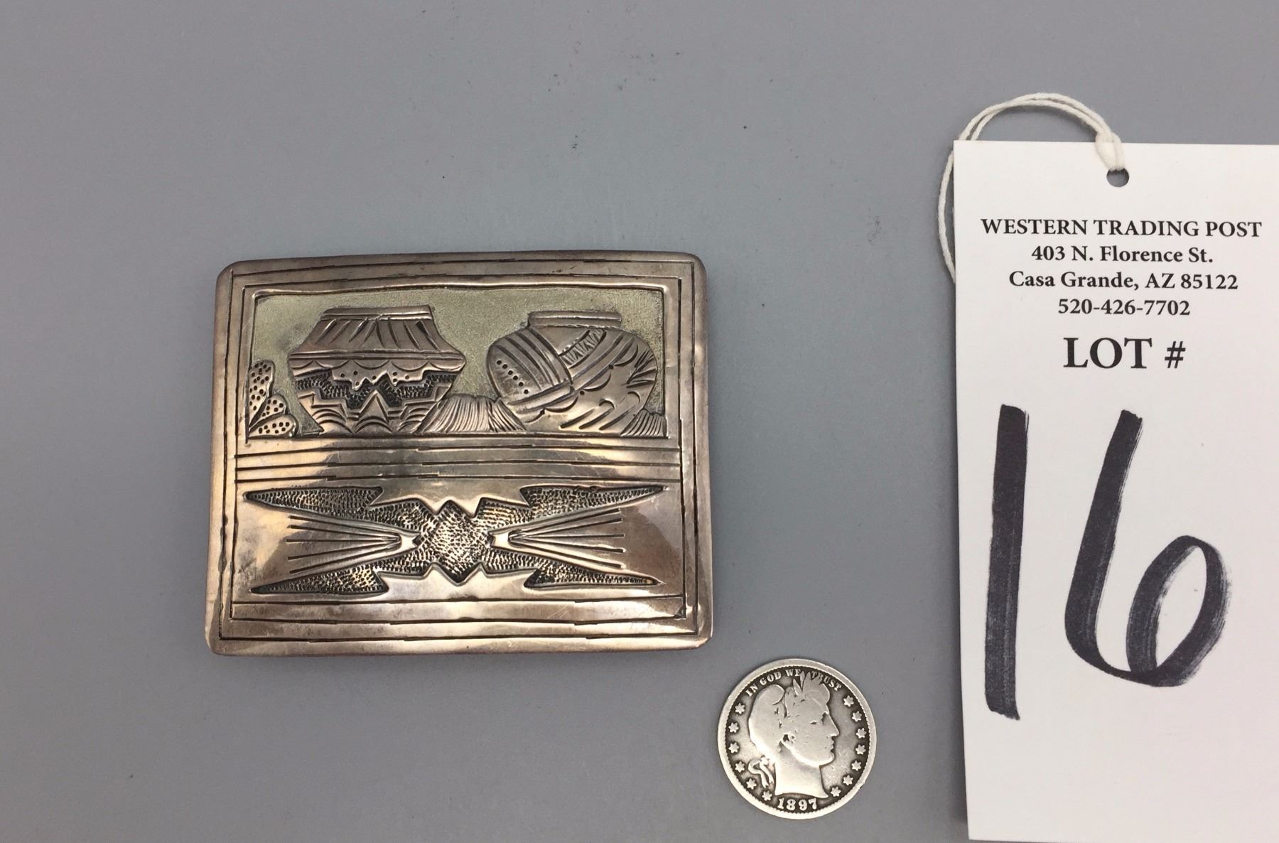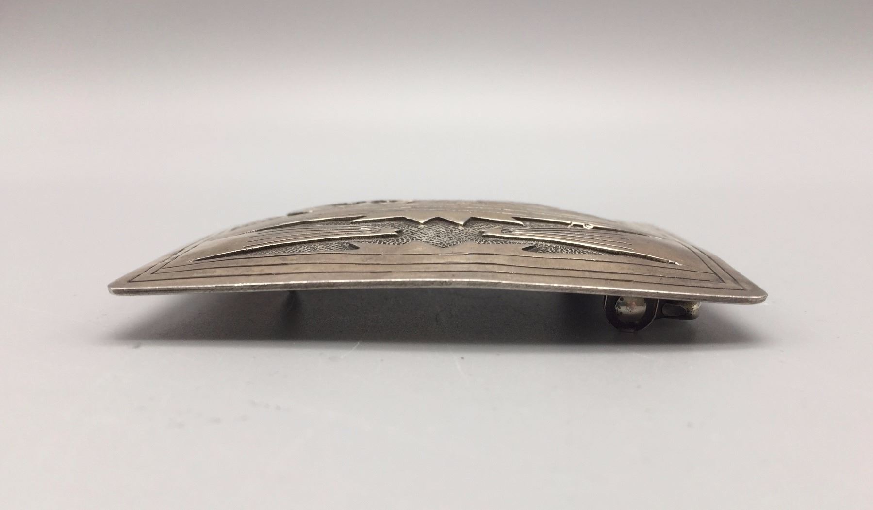 Maker: Gilson Smith, Navajo. Approx. Age: Circa 1980s. Size: Measures 3” w 2 3/8” h. Weighs 52 g. Additional Info: Sterling silver overlay with designs. Condition: Good for it’s age, normal wear expected. Please look closely at the pictures - they are an important part of our description. Shipping: There will be a $5 handling / packaging fee for shipping this lot. The actual cost of postage will be added on top of that.