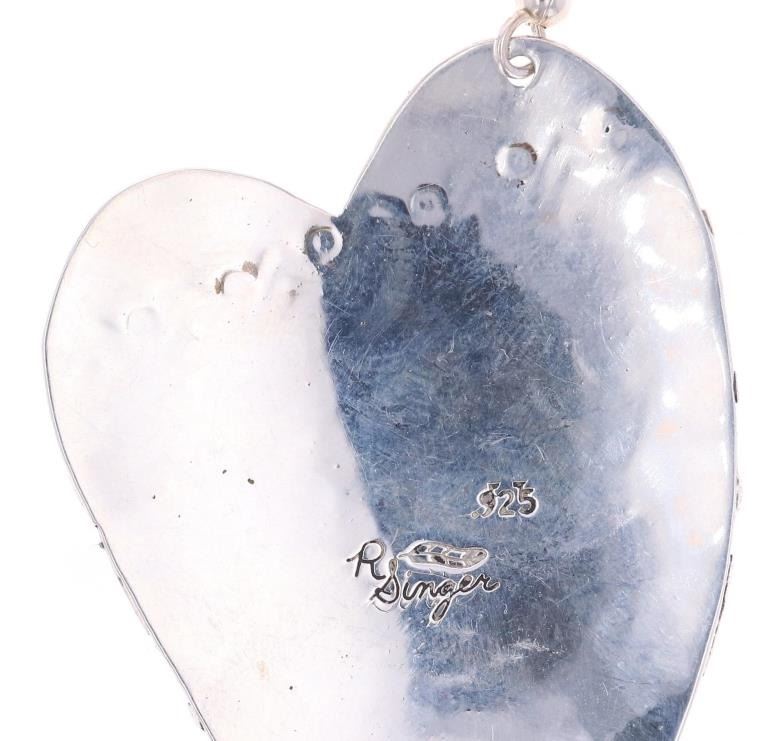 For your consideration is a pair of Navajo Sterling Silver Overlay Earrings from Navajo Diné artist Richard Singer. The heart-shaped earrings feature a wonderfully and professionally crafted sterling silver and intricate tooled design of geometric patterns. Richard Singer is a third-generation Navajo artist. He is from Standing Horse Mesa on the Navajo Reservation in Arizona. The earrings are marked 'R. Singer' with a feather for the hallmark and '.925'. The condition of this pair of Navajo earrings is good with no obvious signs of damage. The measurements of this pair of earrings is 2"L x 1.375"W, weight 19.2 grams.