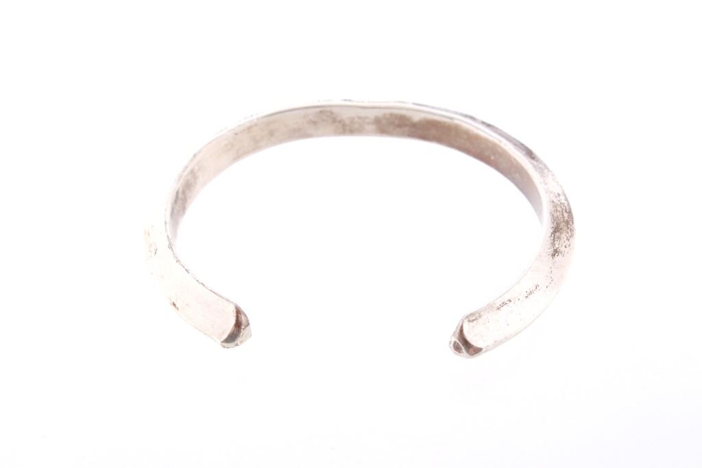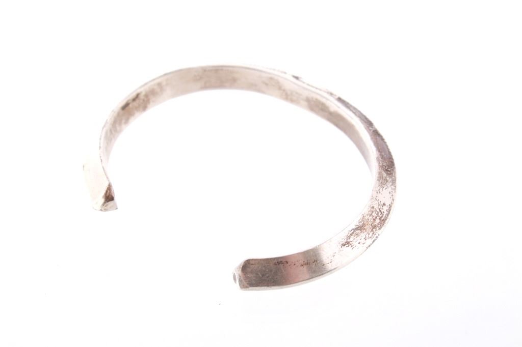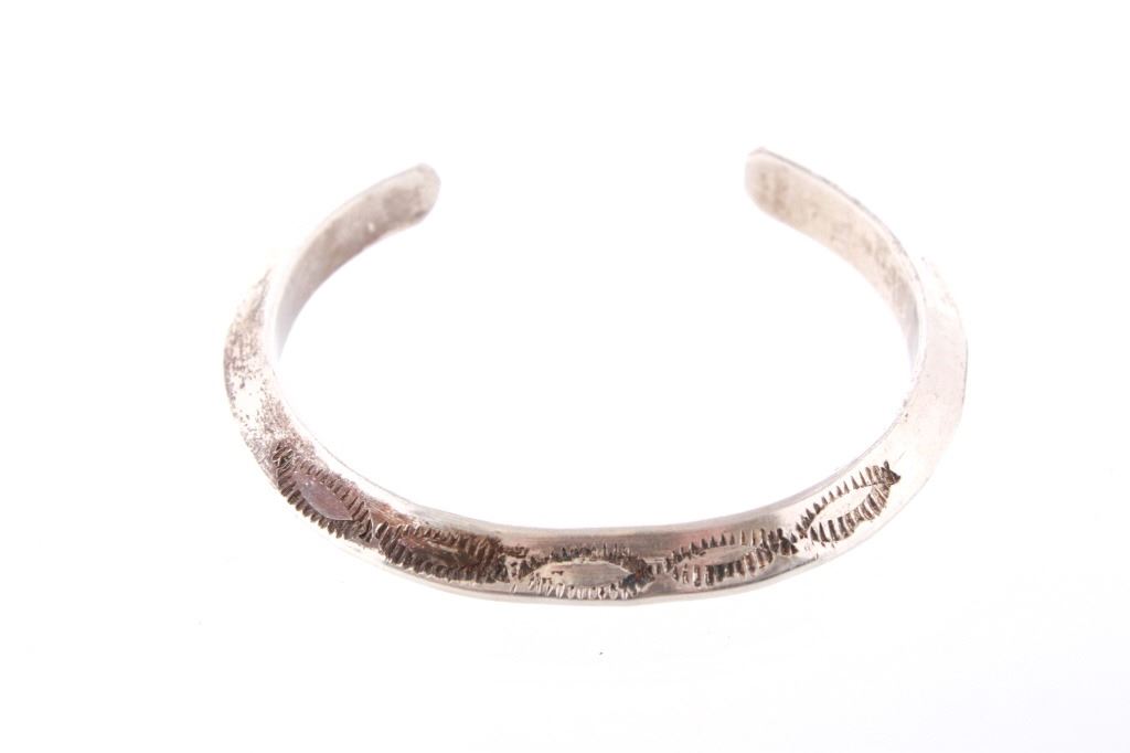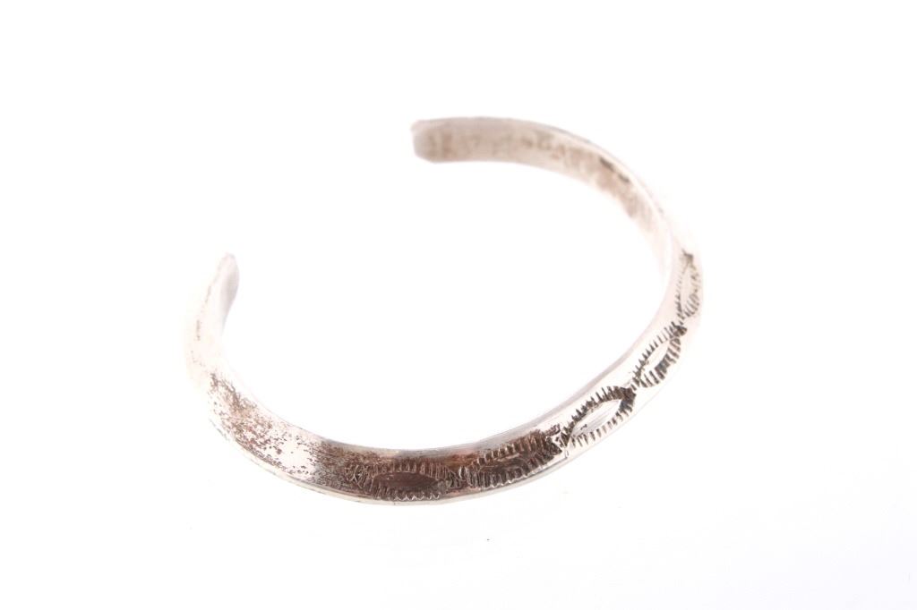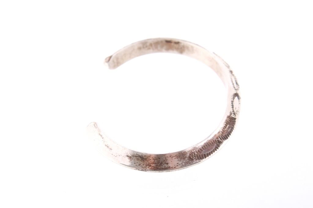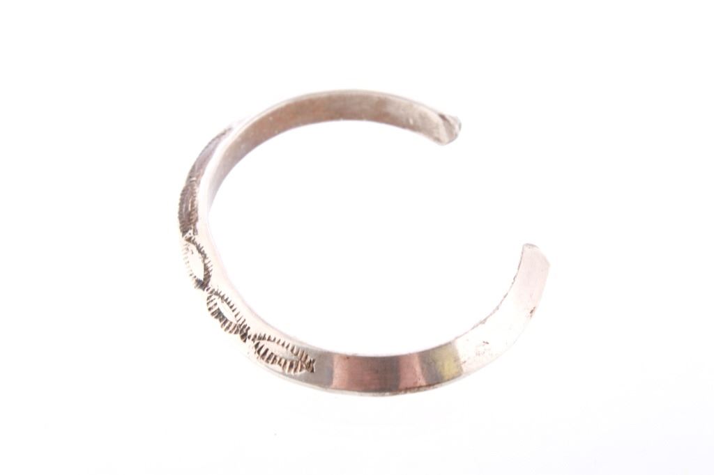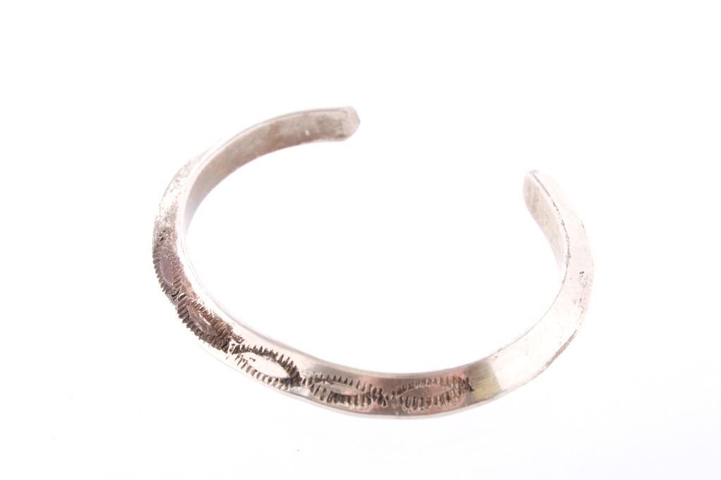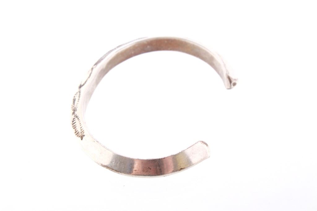 Featured in this lot is this Navajo sterling silver raised rim tooled bracelet. The bracelet shows a wonderfully and professionally crafted raised rim sterling silver construction that shows a triangular design that shows stamped and tooled decoration to the side walling of the bracelet. The bracelet shows a heavier weight to it. The condition of this bracelet is good with no obvious signs of damage and in good overall condition. The measurements of this bracelet are 2 1/8" x 2 5/8" x 1/4" and the circumference is 4 1/2". The overall weight of this bracelet is 37.6g.